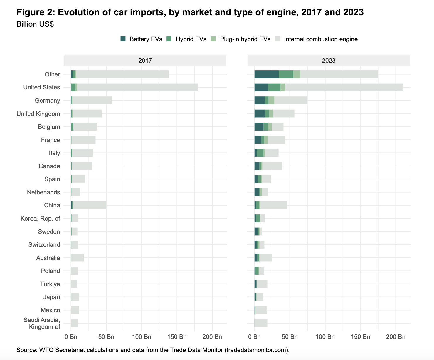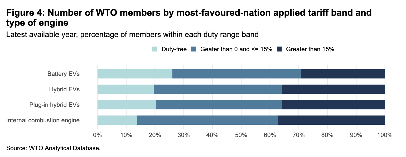 相比之下,混合动力车和插电式混合动力车在四个世贸组织成员中有一个享受免税待遇,而内燃机汽车在六个成员中只有一个享受最惠国免税待遇。