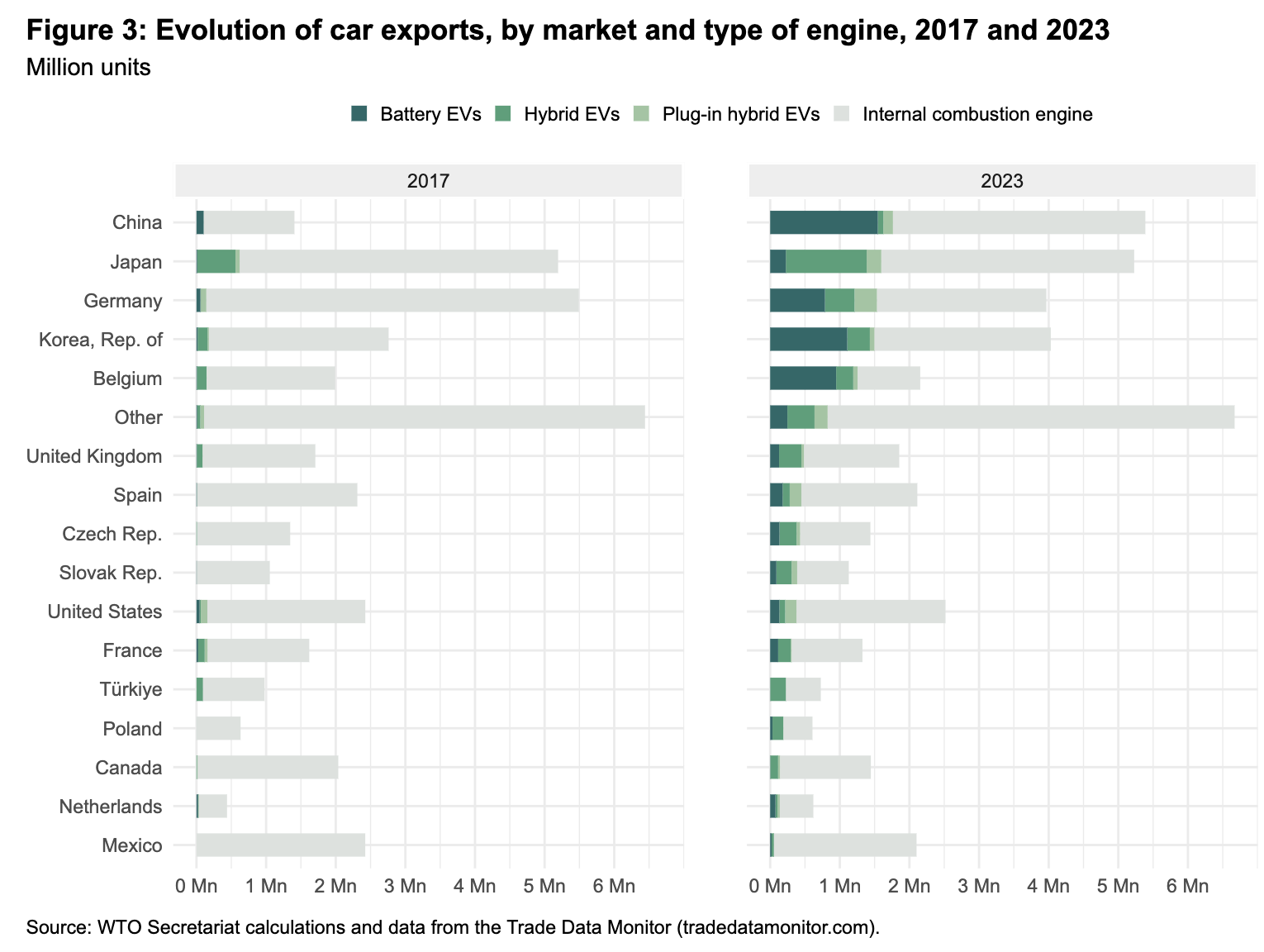 2017 年,德国和日本是乘用车的最大出口国,但它们出口的电动汽车比例微乎其微。相比之下,到 2023 年,这些国家出口的汽车中约有三分之一是电动汽车。通过加强对混合动力汽车出口的重视,日本已成为全球最大的混合动力汽车出口国。