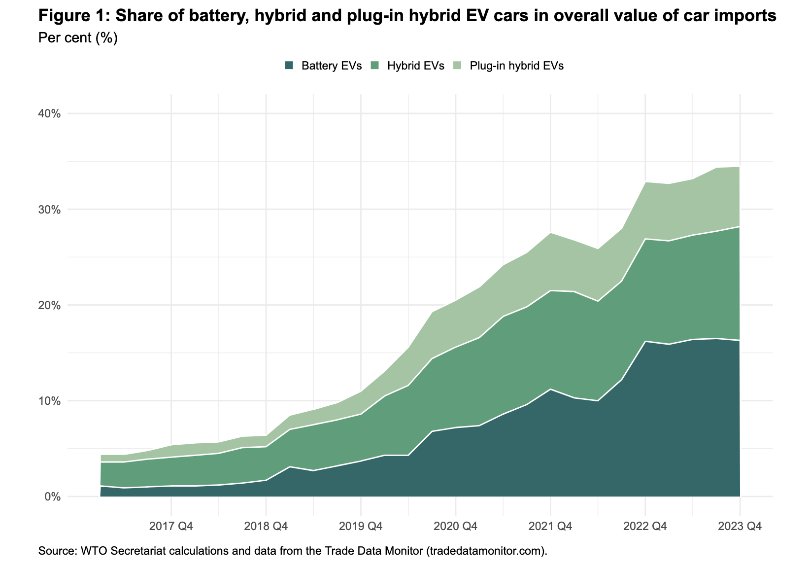 2017 年至 2023 年的进口数据显示,汽车总体上正急剧转向电动汽车。最初,按价值计算,混合动力汽车、插电式混合动力汽车和电池电动汽车在汽车进口总量中所占比例不大,分别约为 2.5%、0.8% 和 1%。然而,自那时起,电动汽车贸易大幅增长。