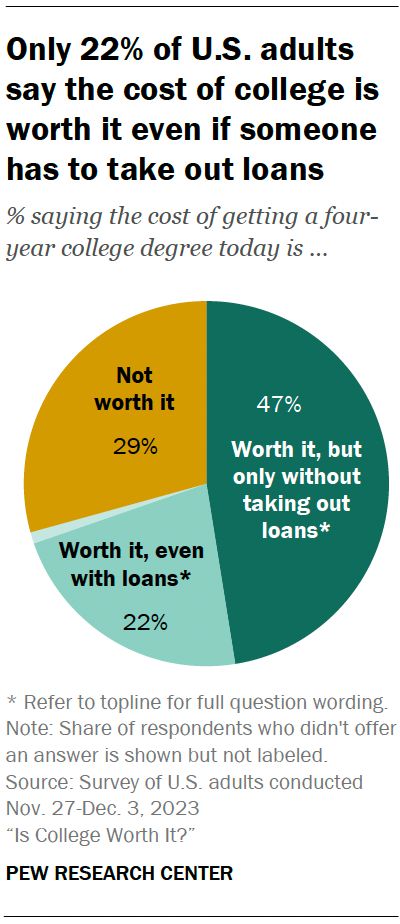 在美国的某些大学,获得学士学位可能需要每年花费将近10万美元。根据皮尤研究所周四公布的一份最新调查报告,大多数美国人认为这笔学费花得值,但在认同这一观点的人当中,大多数认为其前提是不必贷款求学才算值得。只有22%的美国人认为,即使贷款求学,上大学也是值得的。