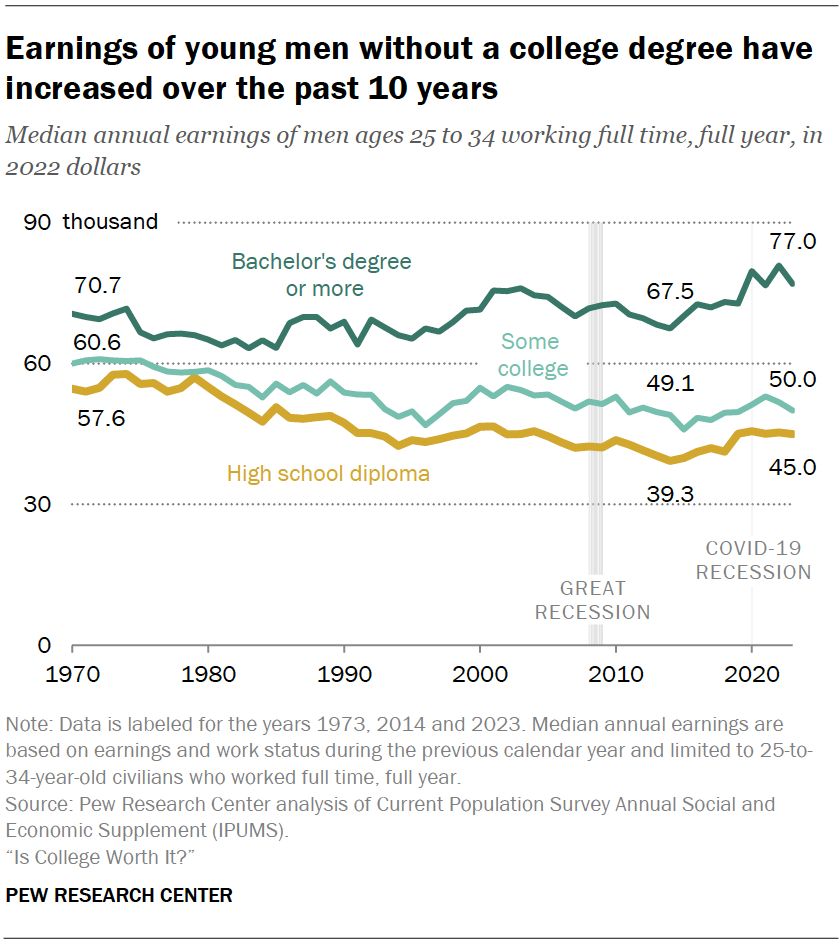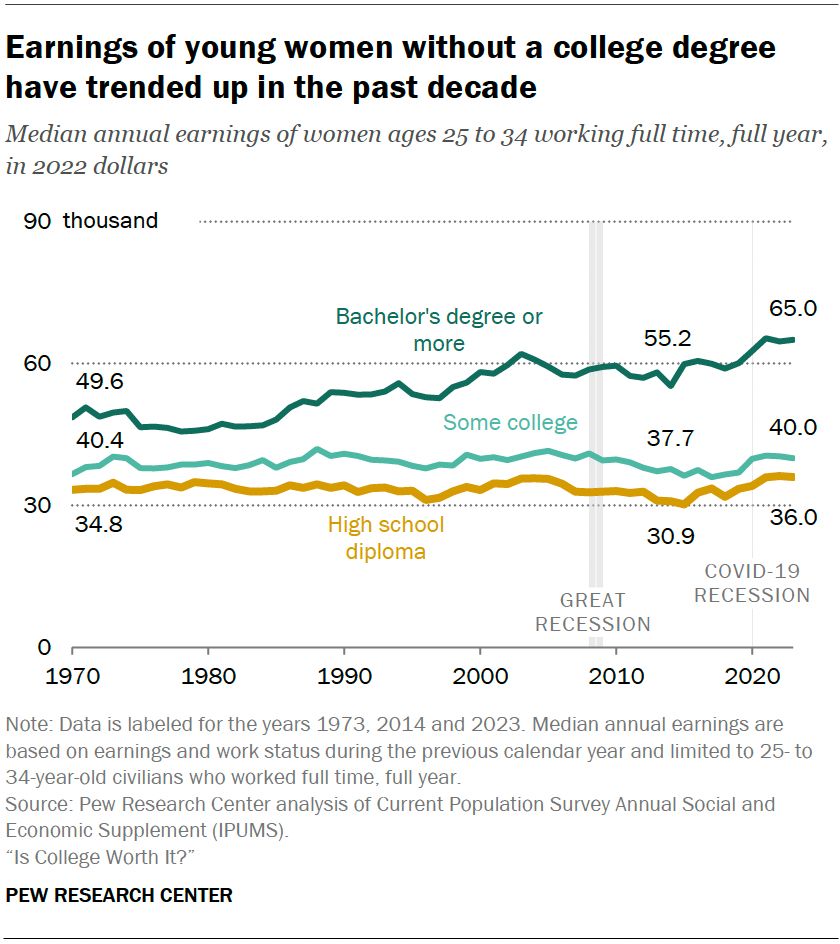 除此之外,皮尤调查报告还发现,那些只接受过部分大学教育或者只有高中文凭者,其收入与高学历者的差距显著拉近。