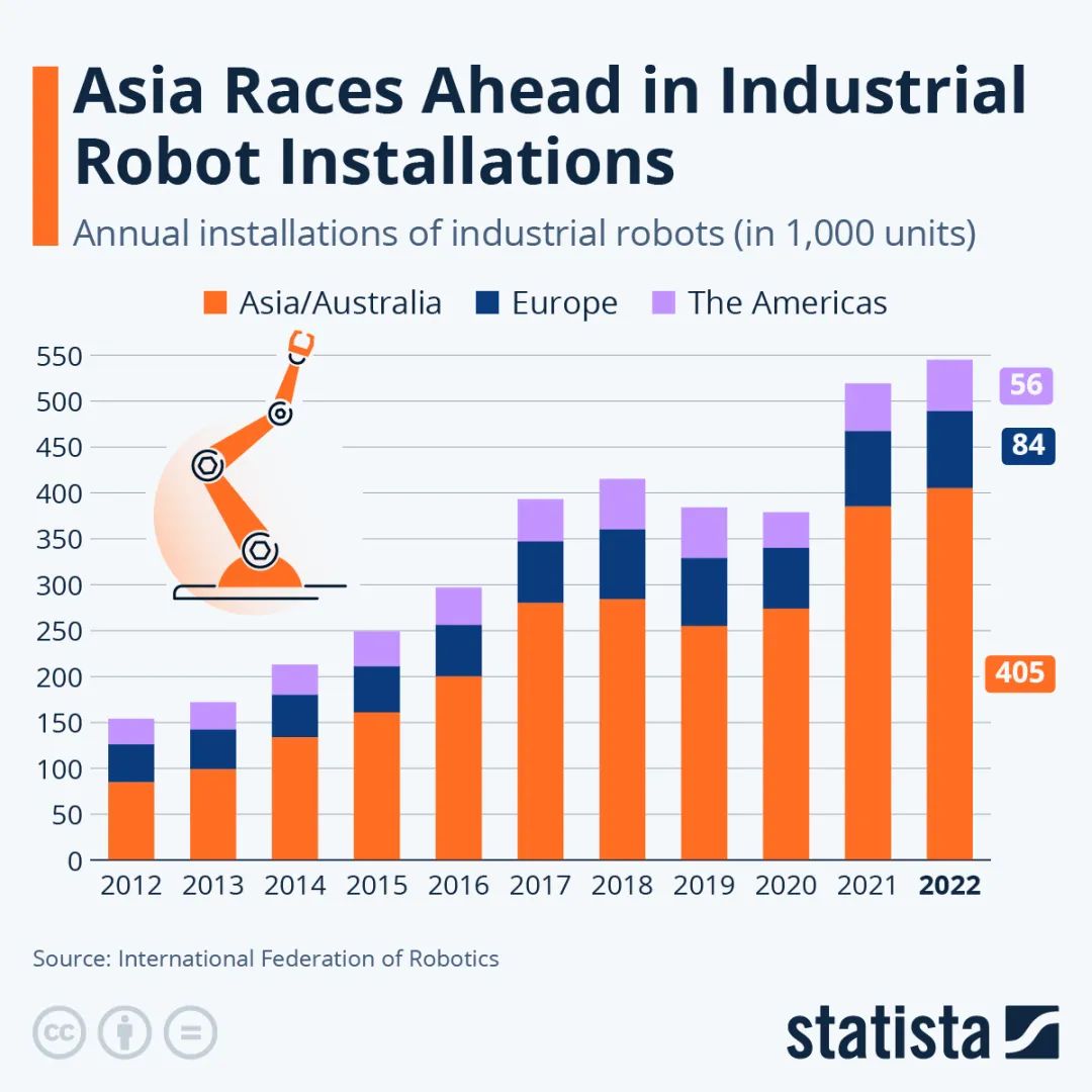根据国际机器人联合会(IFR)的数据,亚洲是全球最大的工业机器人市场,到 2022 年,近四分之三的新部署机器人安装在亚洲。