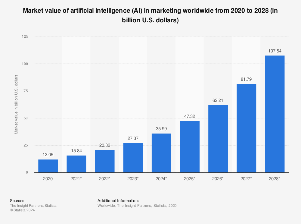 2020-2028年全球营销领域人工智能(AI)市场价值(单位:十亿美元)。数据来源:Statista.com