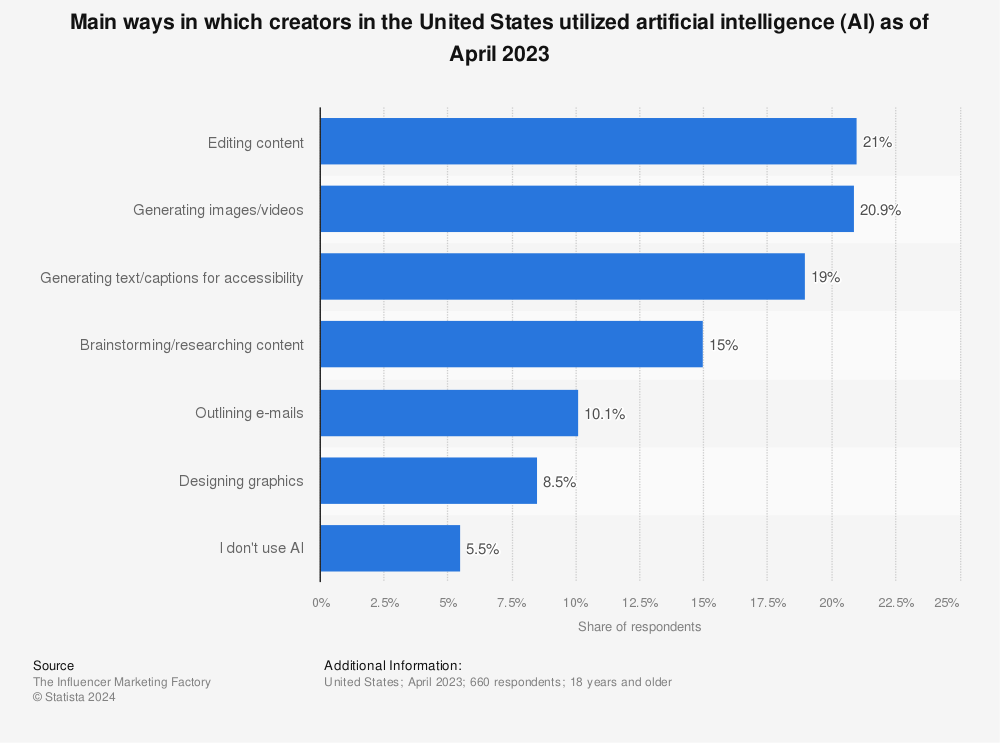 截至2023年4月,美国创作者利用人工智能(AI)的主要方式。数据来源:Statista.com