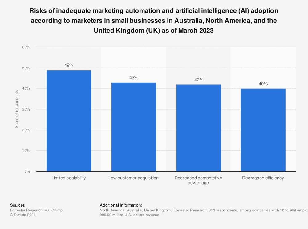 截至2023年3月,澳大利亚、北美和英国的小型企业营销人员认为,营销自动化和人工智能(AI)采用不足的风险。数据来源:Statista.com
