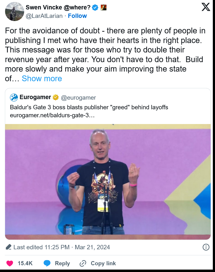 Larian 首席执行官斯文-维克(Swen Vincke)将裁员归咎于公司试图将季度利润持续翻番的贪婪。《矮人要塞》的创作者塔恩-亚当斯(Tarn Adams)说,做出裁员和取消游戏决定的高管们可以”吃翔”了,并补充说他们是受贪婪驱使的可怕的坏人。