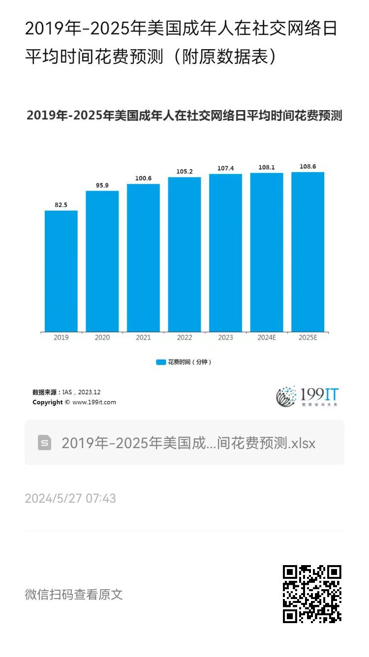 2019年-2025年美国成年人在社交网络日平均时间花费预测(附原数据表) 更多阅读:2018-2020年印度的社交网络用户规模(附原数据表) 2023年全球社交网络用户增长率预测(附原数据表) 2022上半年全球主要社交网络活跃用户数量(附原数据表) 2019-2024年全球社交网络用户规模及增长率(附原数据表) We Are Social:2018年Q1全球互联网概览报告GlobalWebIndex:东南亚用户社交网络分析Twitter:2Q19日活用户加速增至1.39亿人Q&Me:2019越南网民社交网络行为调查报告eMarketer:2019年51.7%的美国社交网民将只通过移动设备访问平台vpnMentor:2017年美国及全球的互联网发展趋势、统计数据及事实概况游戏的兴起:消费者情绪研究报告报告:超过半数年轻人正在减少社交媒体使用量麻省大学达特茅斯分校:Inc. 500强企业社交媒体使用情况调查Brandwatch:体育品牌在社交媒体可视性方面更有优势Sprout Social:2/3的消费者认为品牌应公开其对社会问题的立场