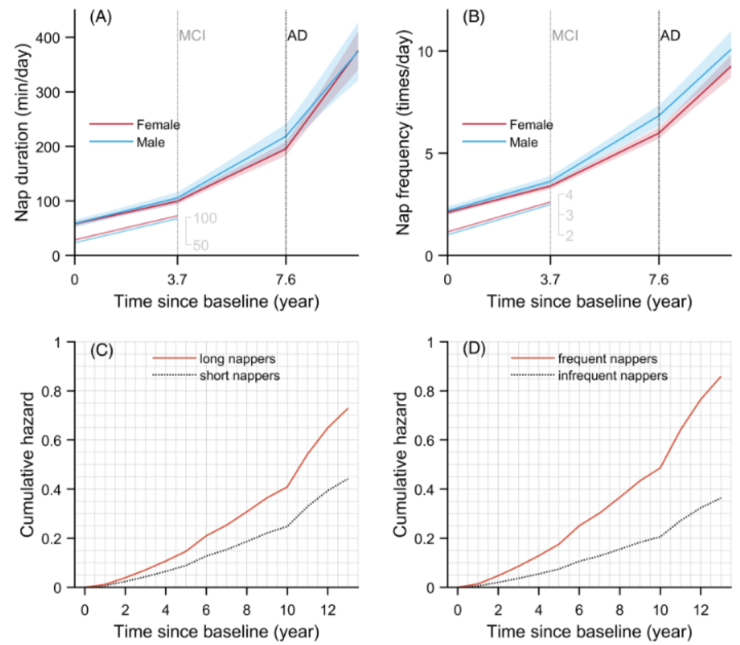 在长达14年的随访期间,研究者发现了个现象——是否患阿尔茨海默症会影响午睡时长——午睡时间以及频率与年龄呈正相关,这种关联在已经出现轻度认知以及阿尔茨海默症的人群中更为显著。