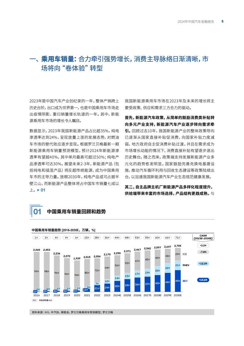 报告指出,当前中国乘用车市场已呈现稳健增长态势,新能源汽车销量的显著提升对传统燃油车市场形成了替代效应。随着经济的稳步回暖,乘用车销量已回归至接近2019年水平,其中新能源汽车的市场份额持续扩大。预计到2030年,整体市场销量将保持约3.4%的复合增长率,新能源汽车销售将迎来加速渗透,市场化需求引领特征更加明显。