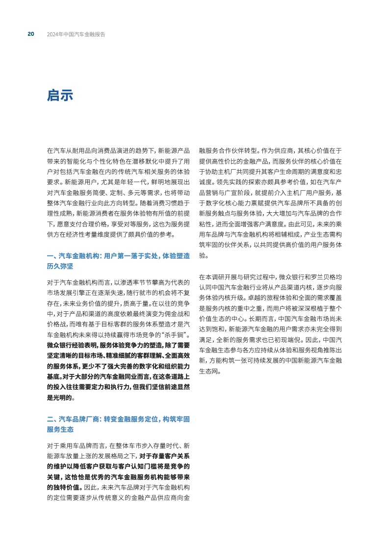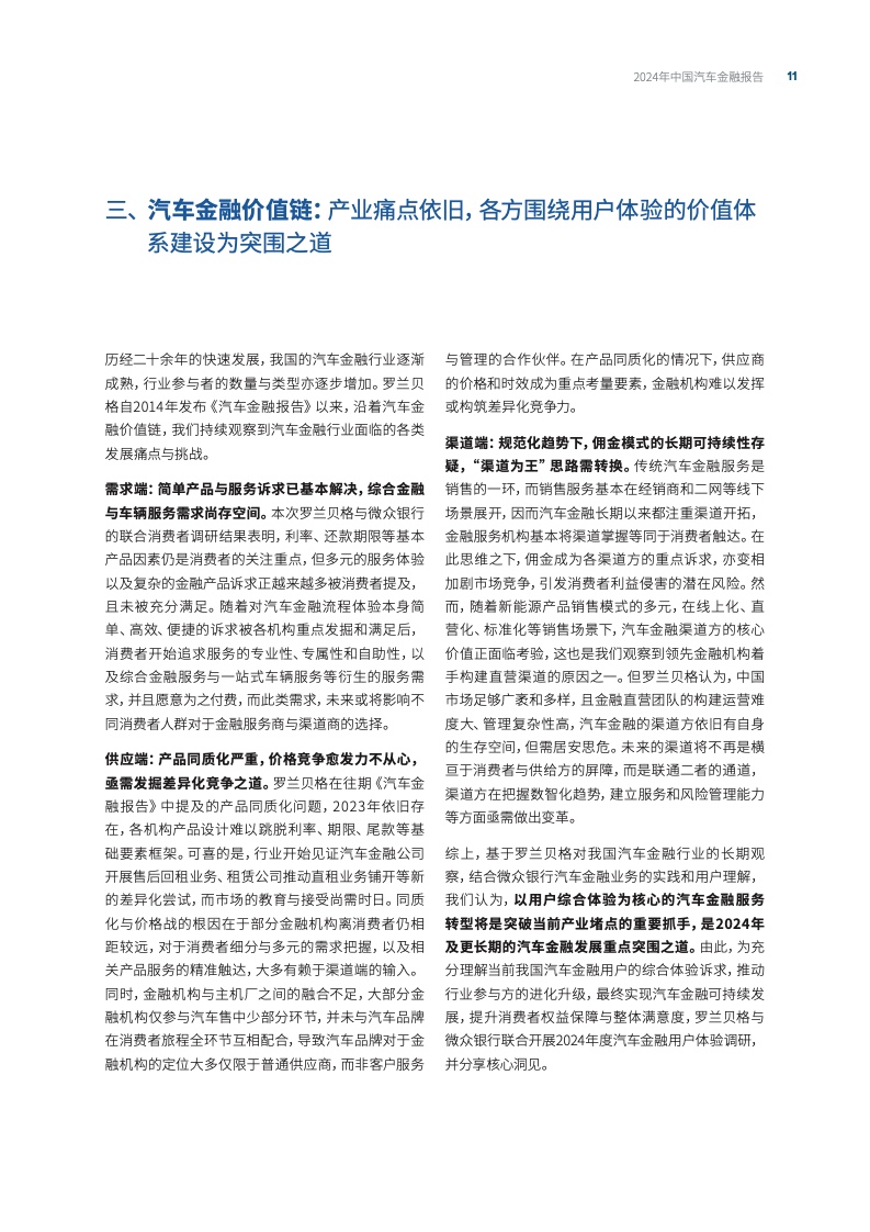 罗兰贝格和微众银行认为,以用户综合体验为核心的汽车金融服务转型将是突破当前行业堵点、寻求差异化发展的关键方向。汽车金融机构和品牌厂商需从产品和渠道竞争转向服务体验竞争,通过精准细腻的客户理解和全面高效的服务体系,提升用户满意度和忠诚度。