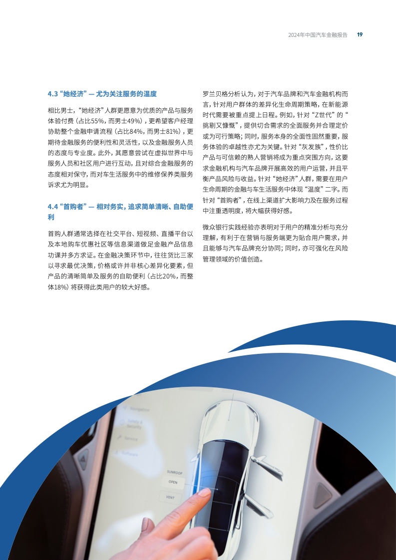 罗兰贝格全球高级合伙人郑赟表示:“在汽车从耐用品向消费品演进的趋势下,新能源产品带来的智能化与个性化特色提升了用户对汽车金融服务的体验要求。汽车金融机构需要基于目标客群的服务体系塑造,以质取胜,赢得市场竞争。”