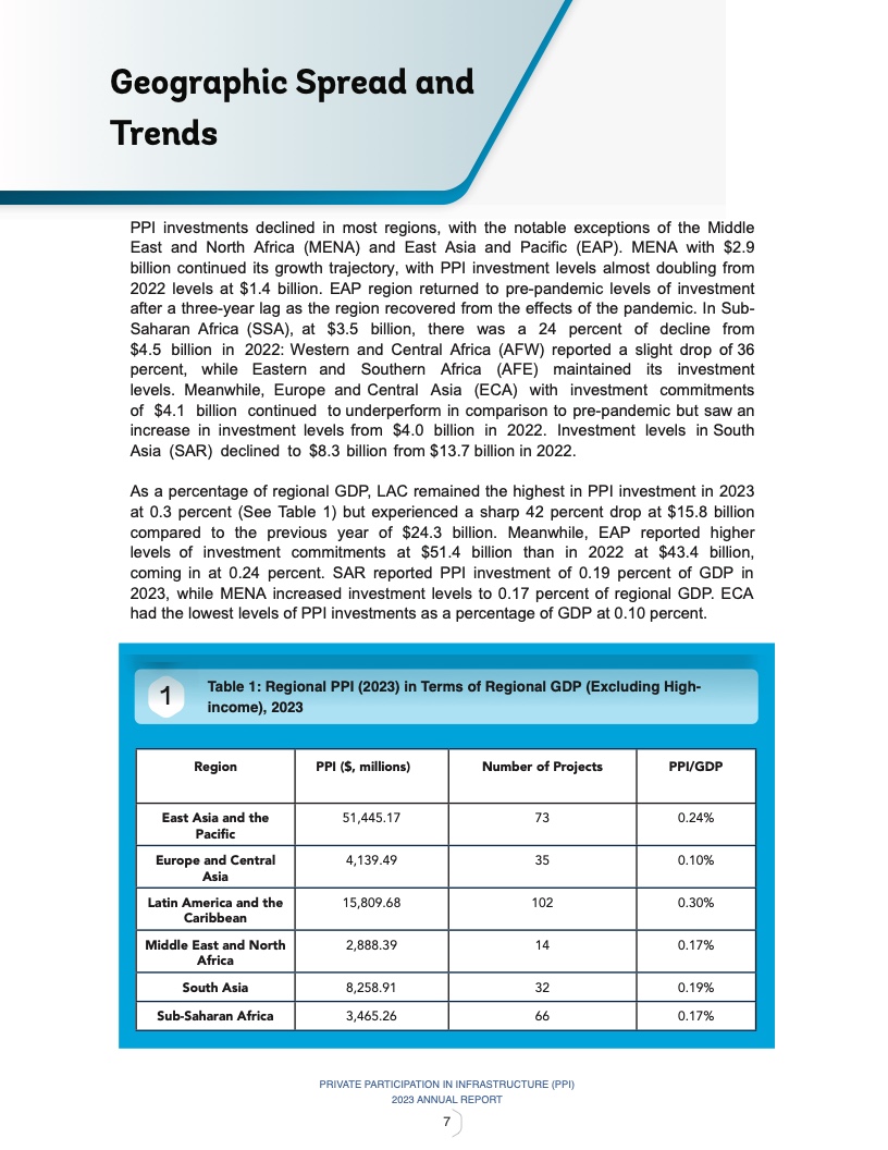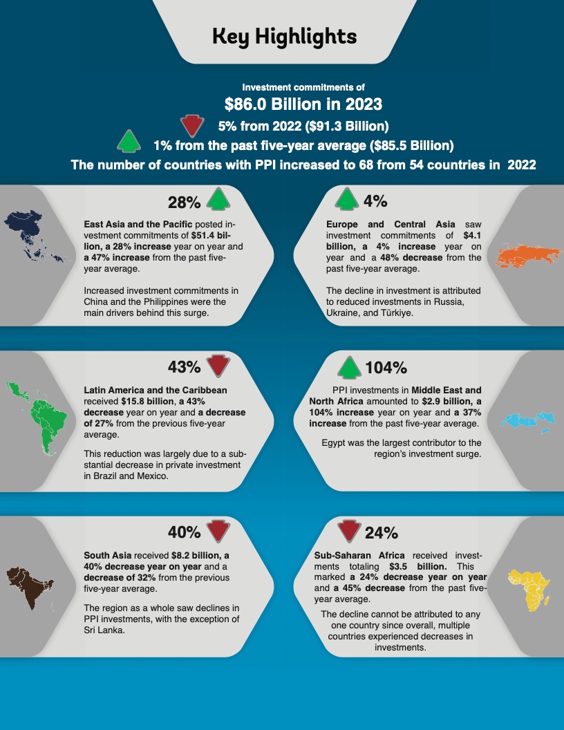 到2023年,大部分地区的私人基础设施投资都出现了下降,不过中东和北非地区(MENA)以及东亚和太平洋地区(EAP)是明显的例外。