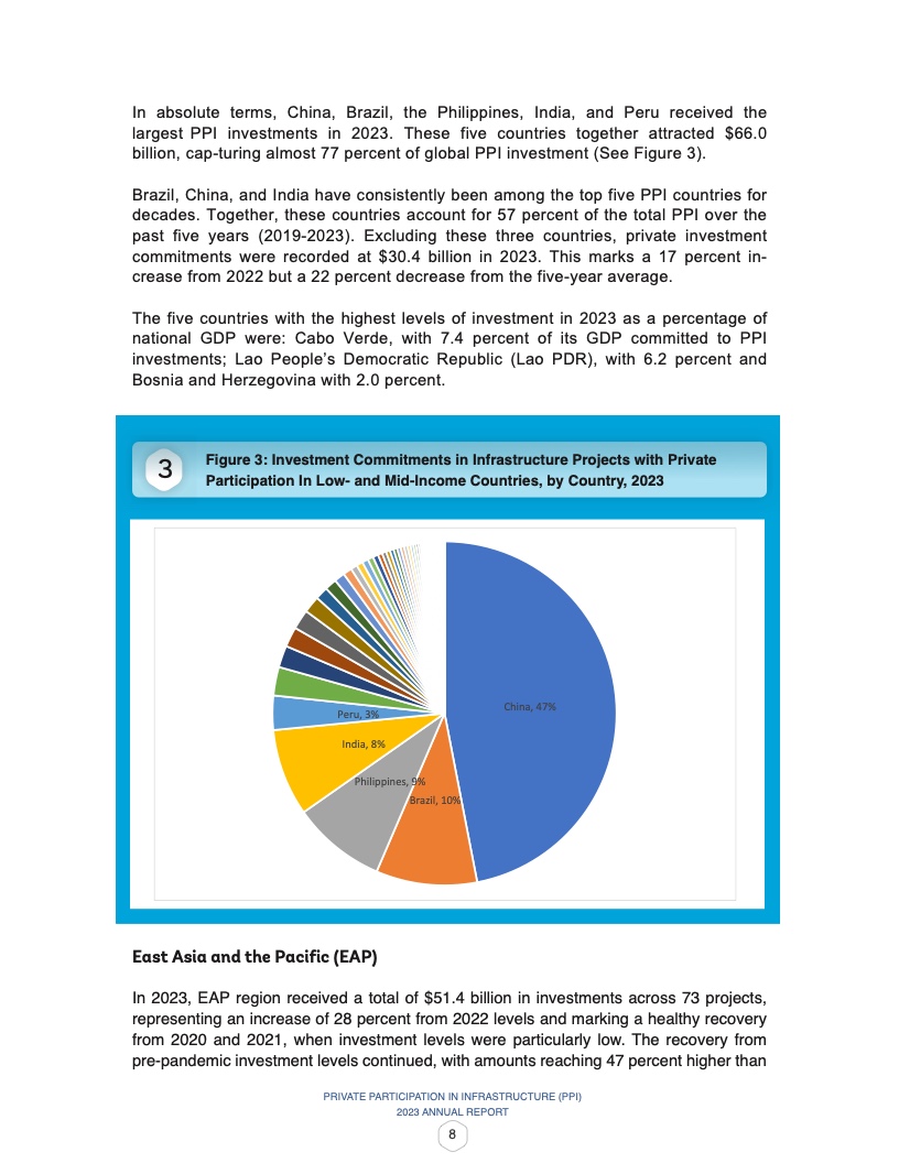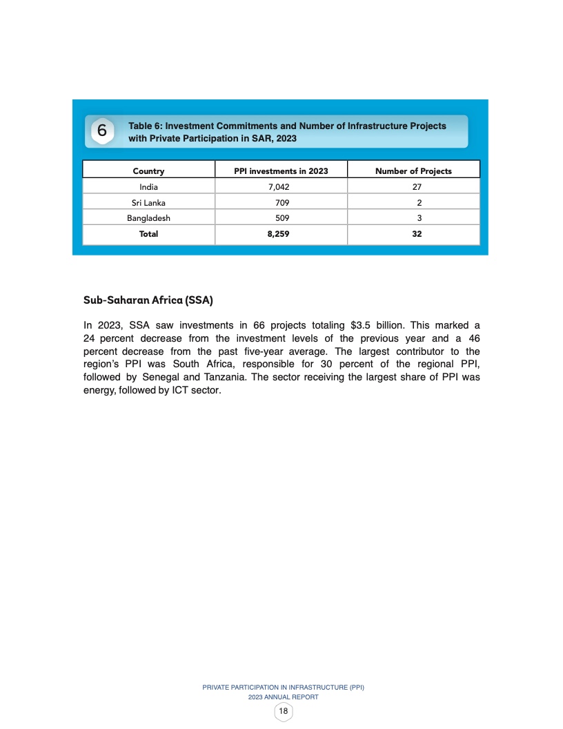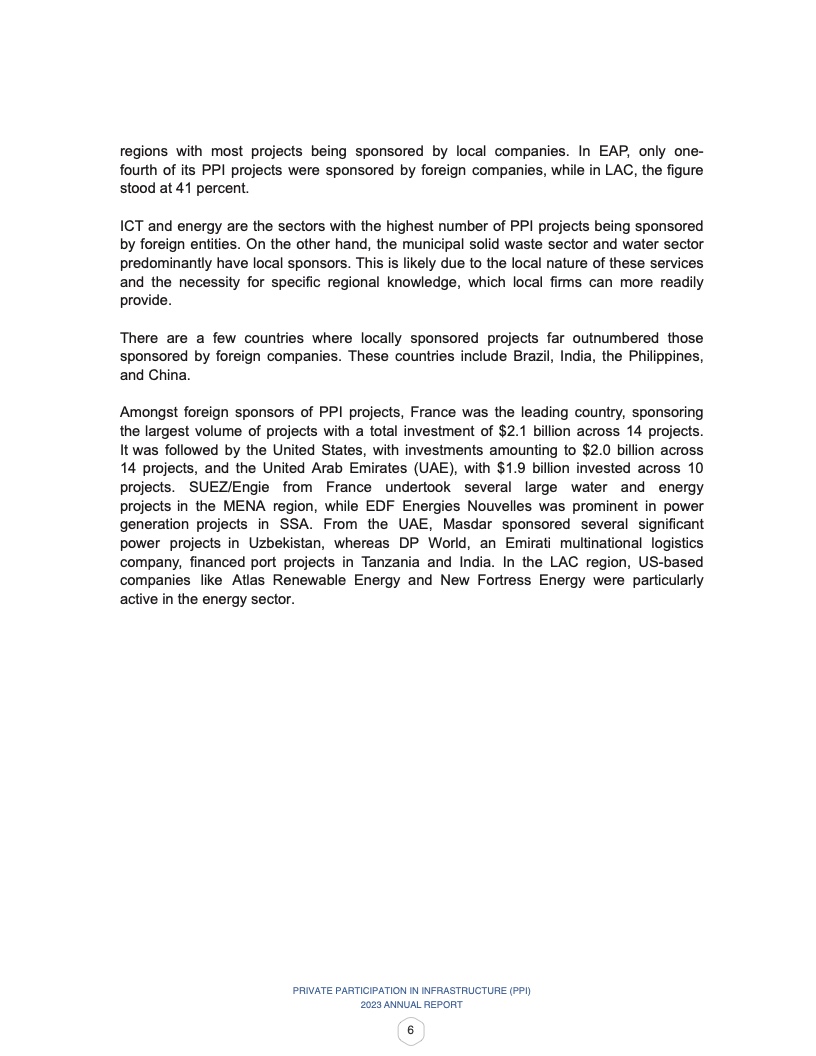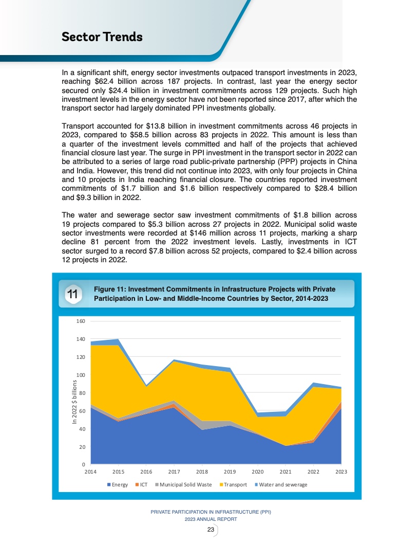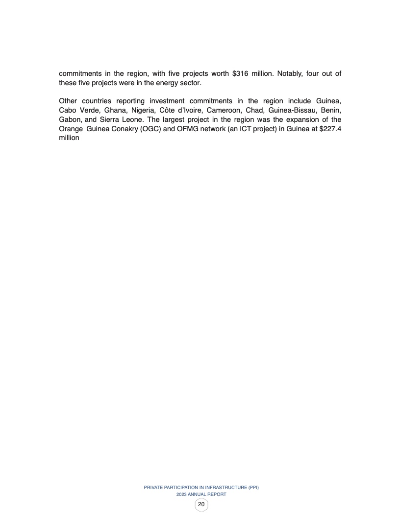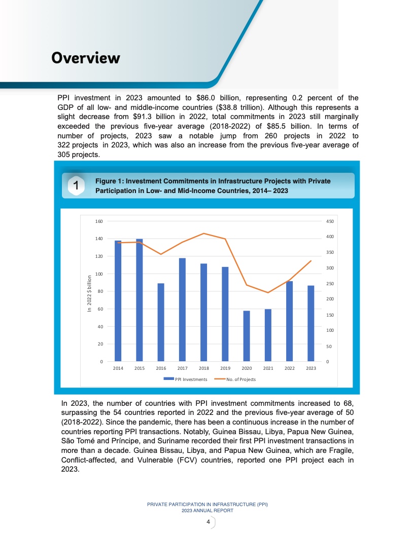 尽管总投资下降,但更多国家和更多基础设施项目获得私人投资。2023年,68个国家的322个项目获得投资,而2022年,54个国家的260个项目获得投资。几内亚比绍、利比亚、巴布亚新几内亚、圣多美和普林西比以及苏里南是超过10亿美元的首批私人融资基础设施(PPI)交易十年。