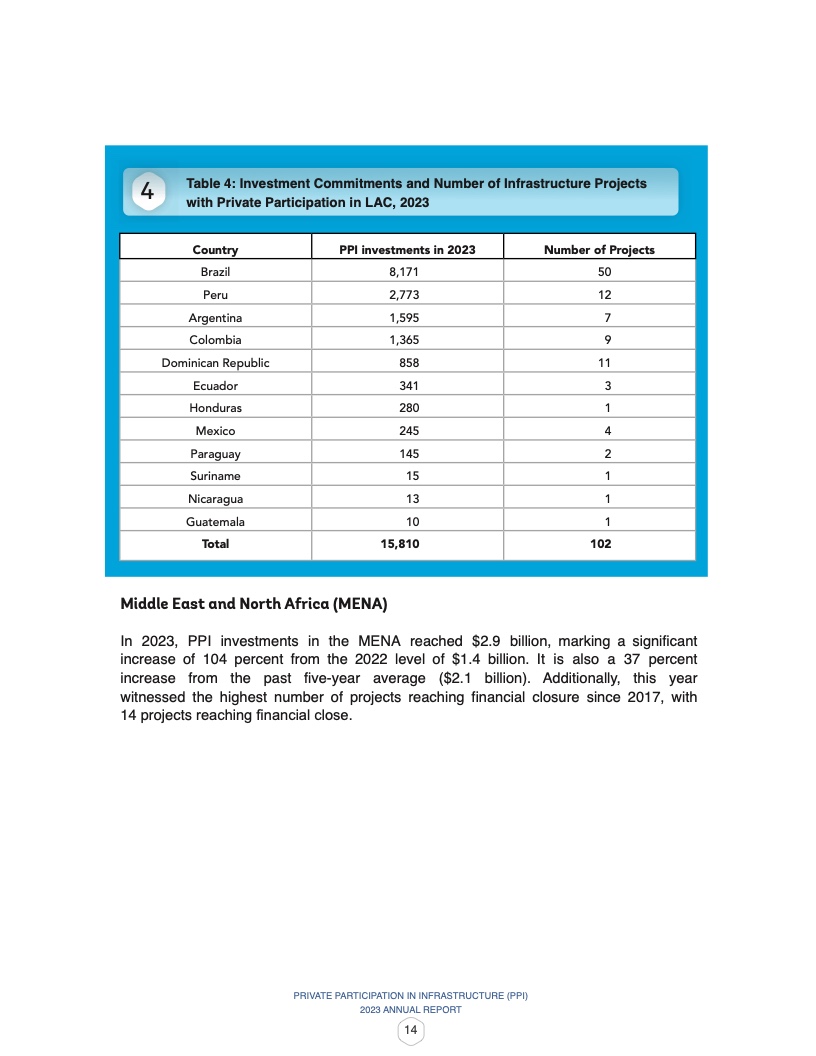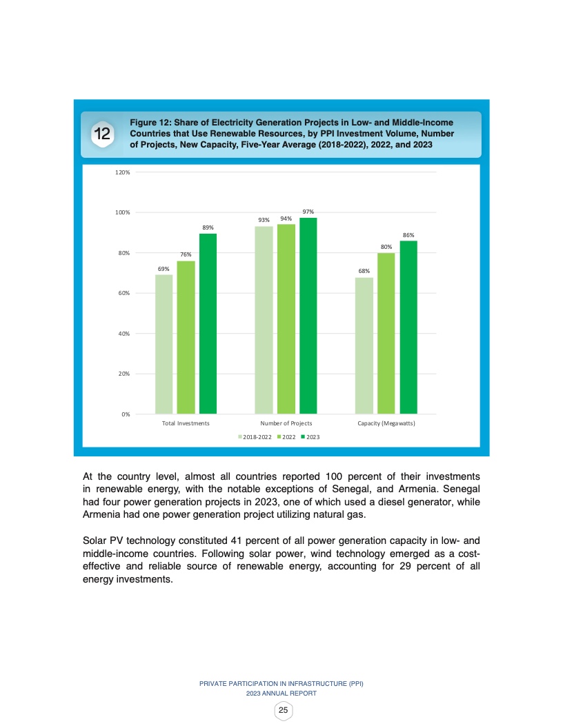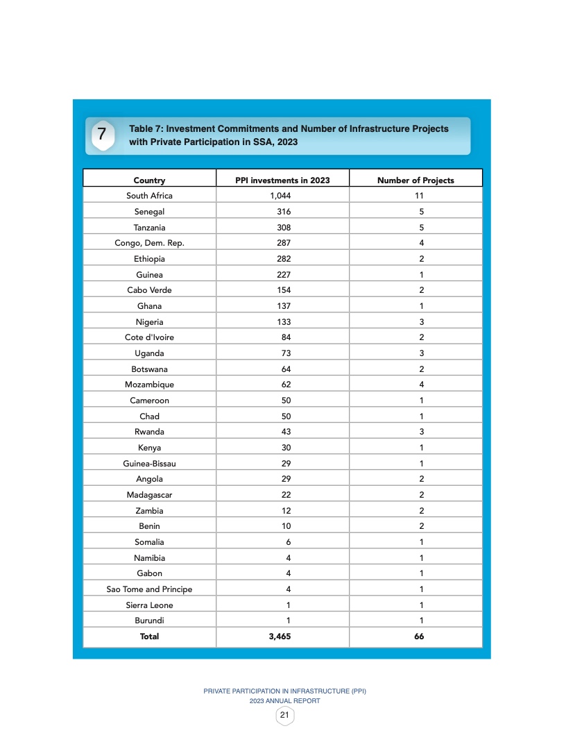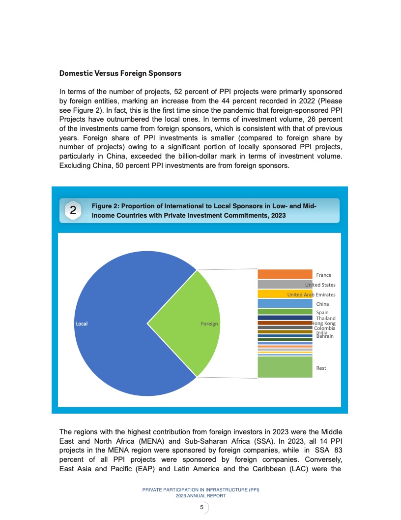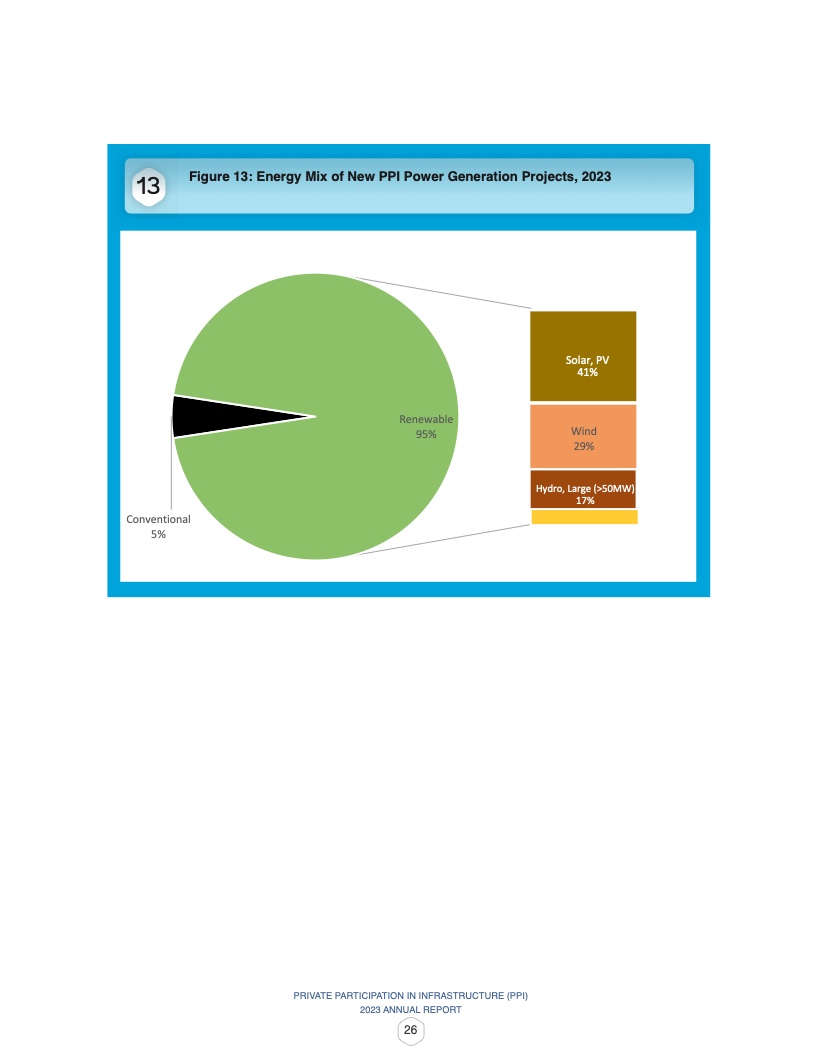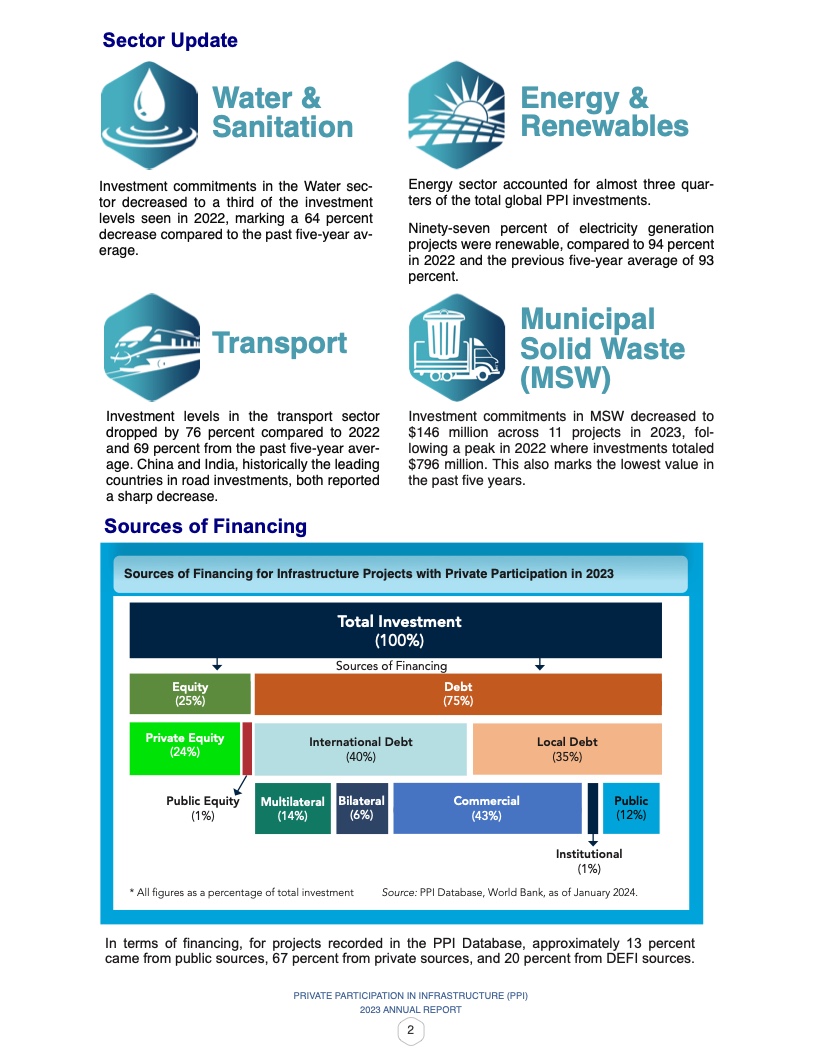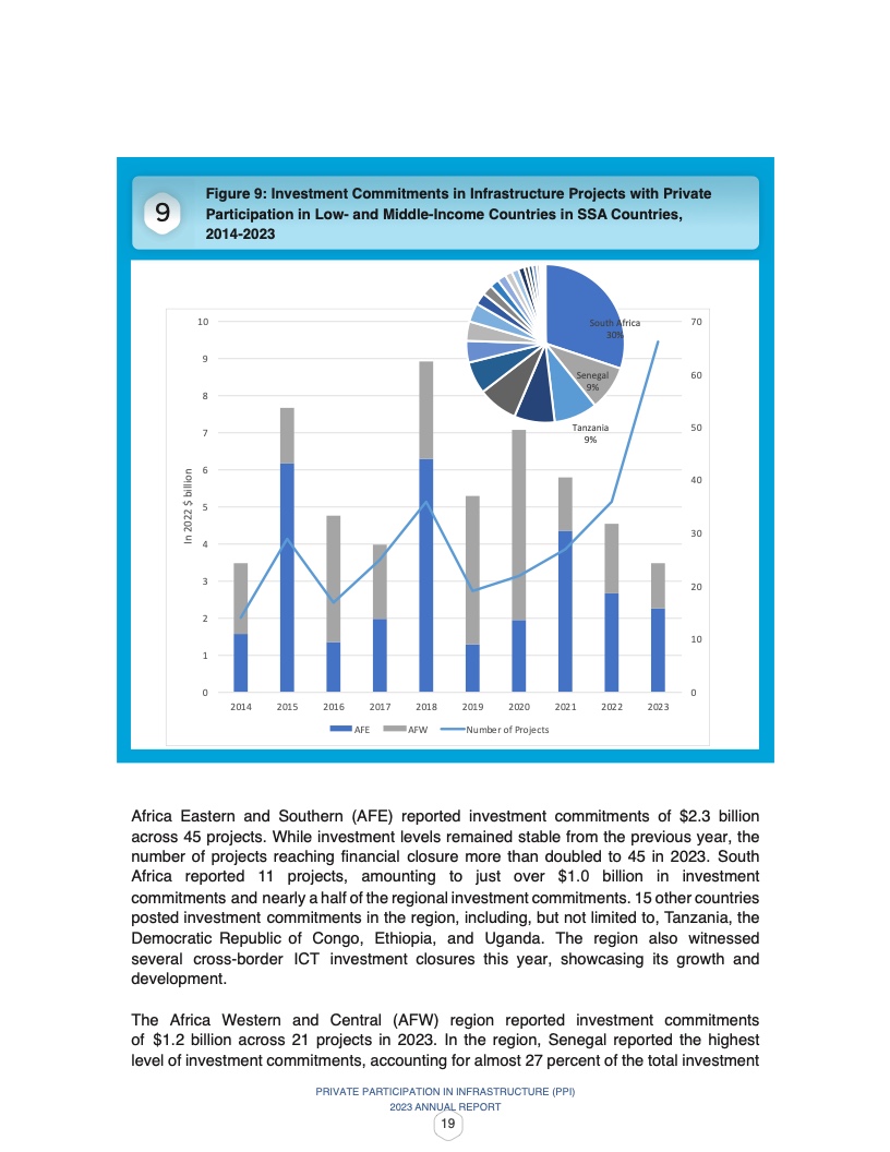 尽管总投资下降,但更多国家和更多基础设施项目获得私人投资。2023年,68个国家的322个项目获得投资,而2022年,54个国家的260个项目获得投资。几内亚比绍、利比亚、巴布亚新几内亚、圣多美和普林西比以及苏里南是超过10亿美元的首批私人融资基础设施(PPI)交易十年。