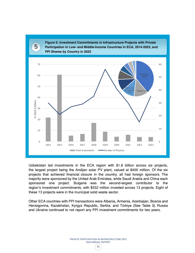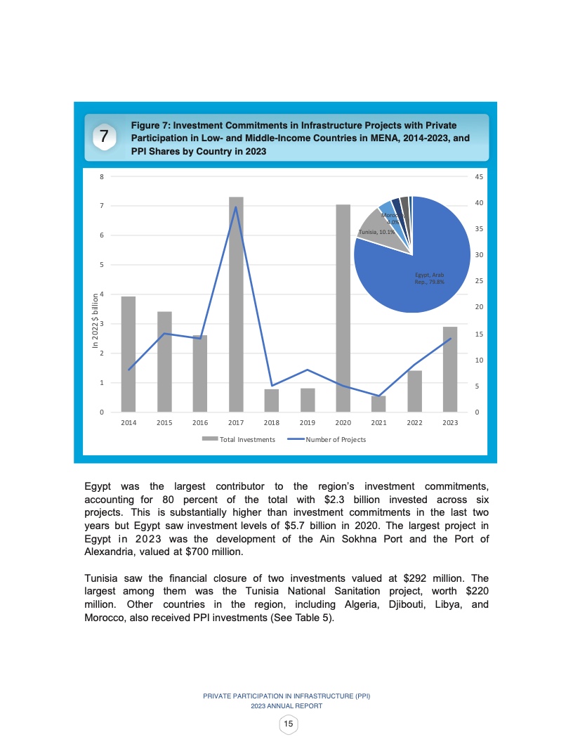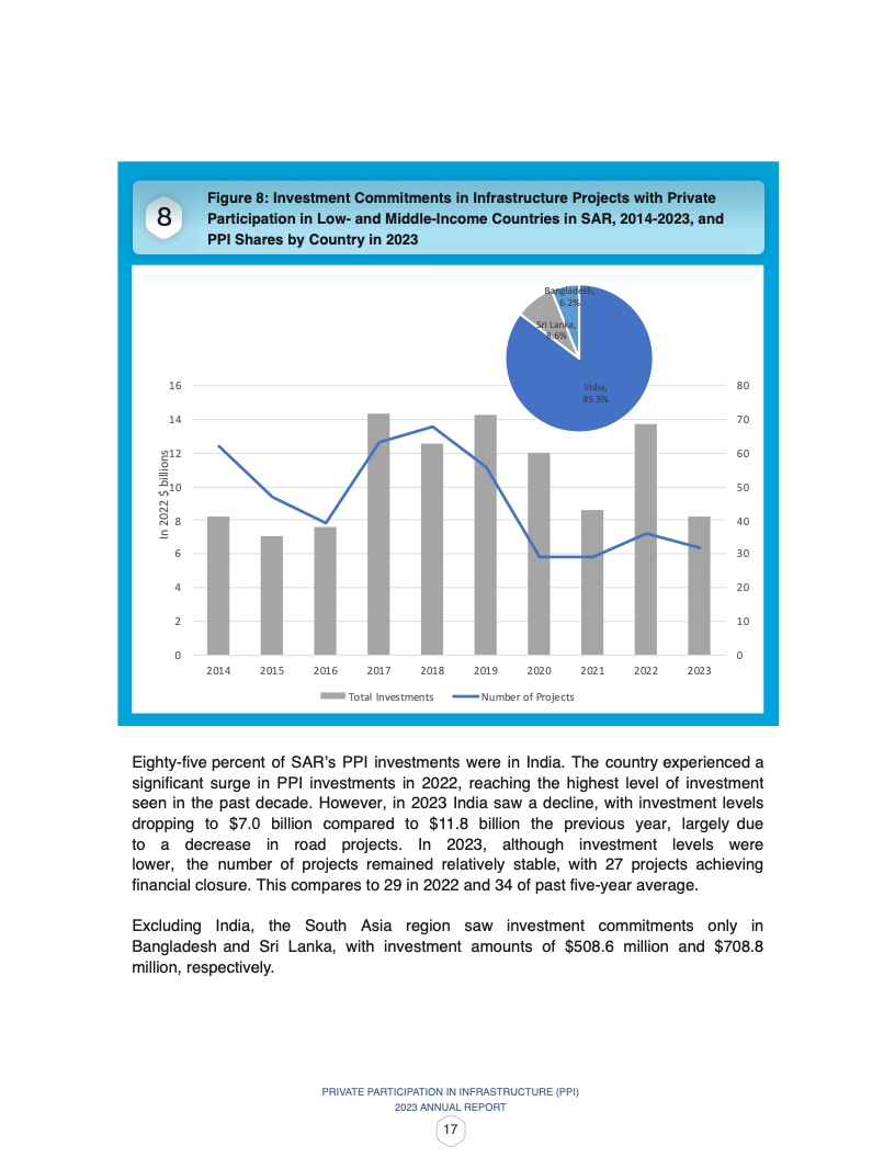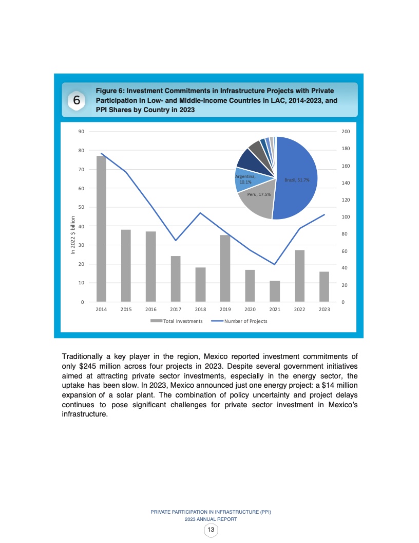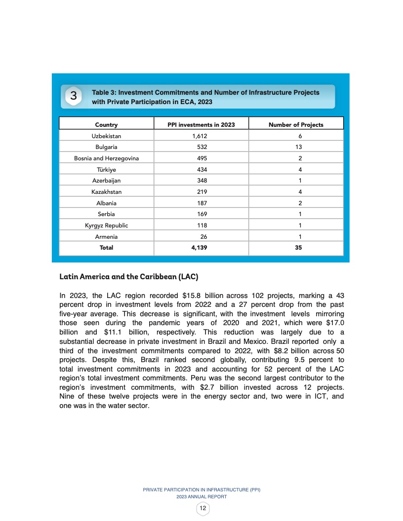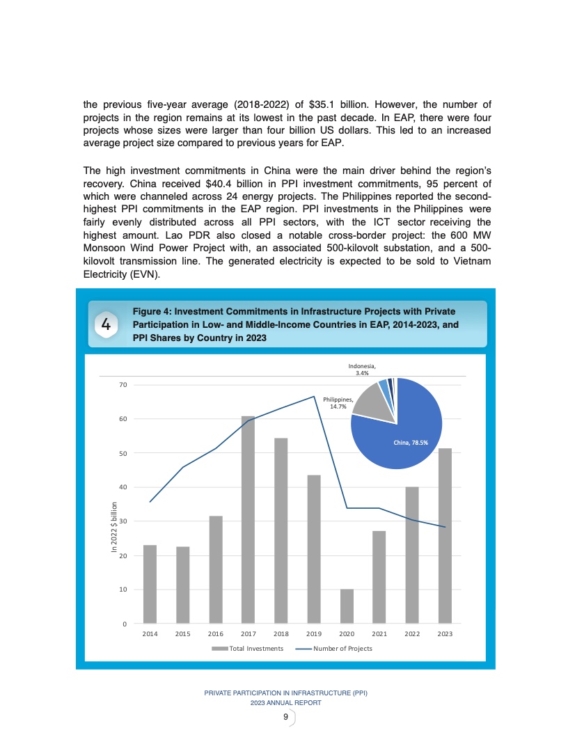 尽管总投资下降,但更多国家和更多基础设施项目获得私人投资。2023年,68个国家的322个项目获得投资,而2022年,54个国家的260个项目获得投资。几内亚比绍、利比亚、巴布亚新几内亚、圣多美和普林西比以及苏里南是超过10亿美元的首批私人融资基础设施(PPI)交易十年。