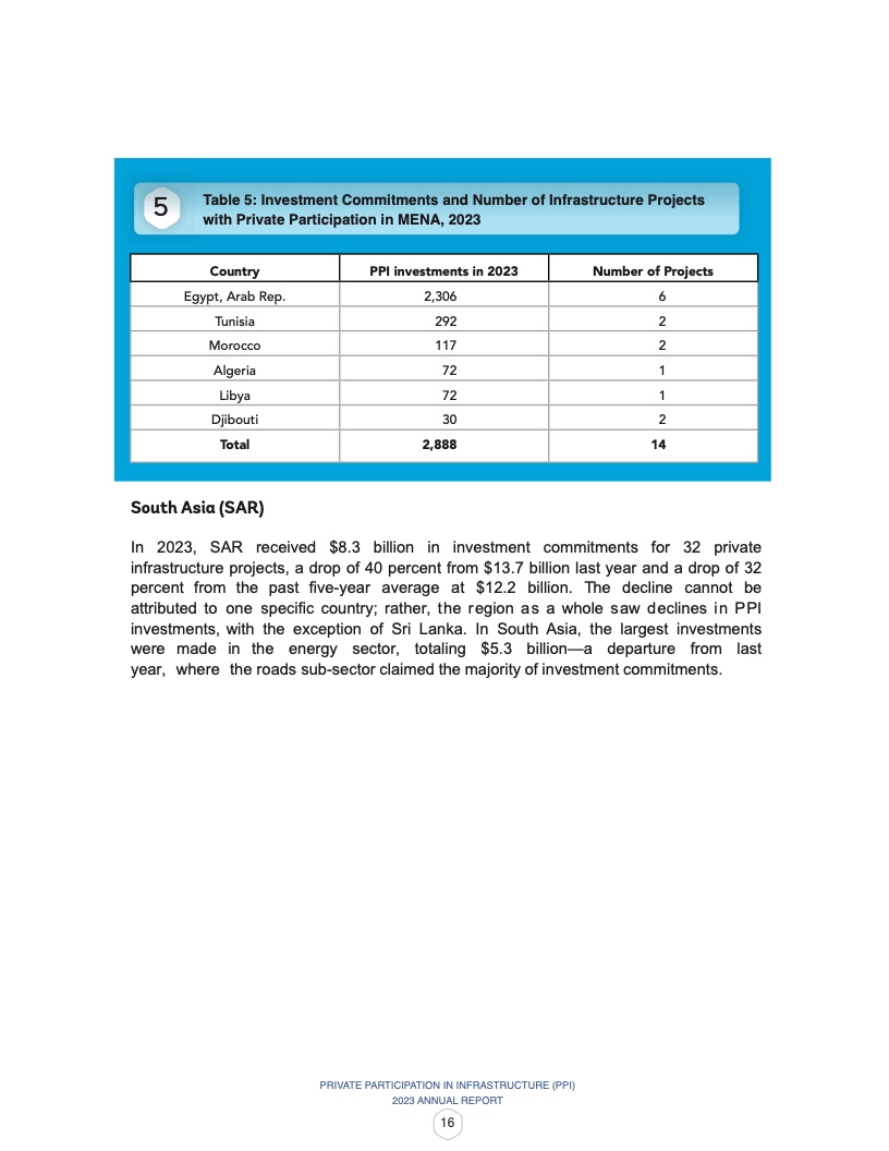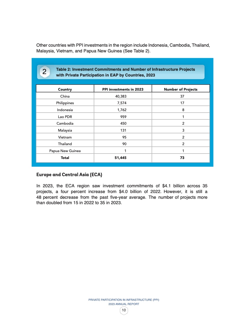 中东与北非地区延续增长态势,2022年的PPI投资额约为14亿美元,增至2023年的29亿美元。东亚与太平洋地区经济活动逐渐恢复,PPI投资额也回升至疫情前水平,摆脱了三年来的低迷。