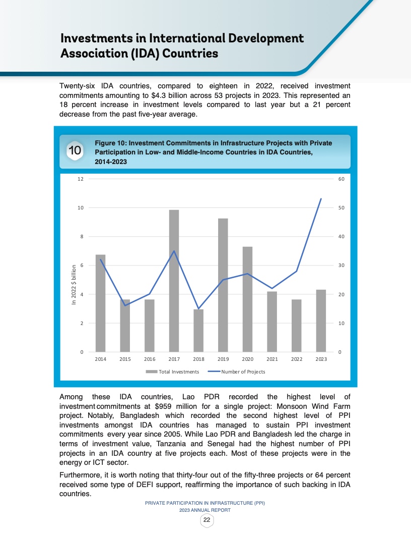 就世界上最贫困的国家而言,2023年有26个国际发展协会(IDA)成员国中有53个项目获得了私人部门的投资承诺,总金额为43亿美元。项目数量较去年增长18%,达到历史最高水平。