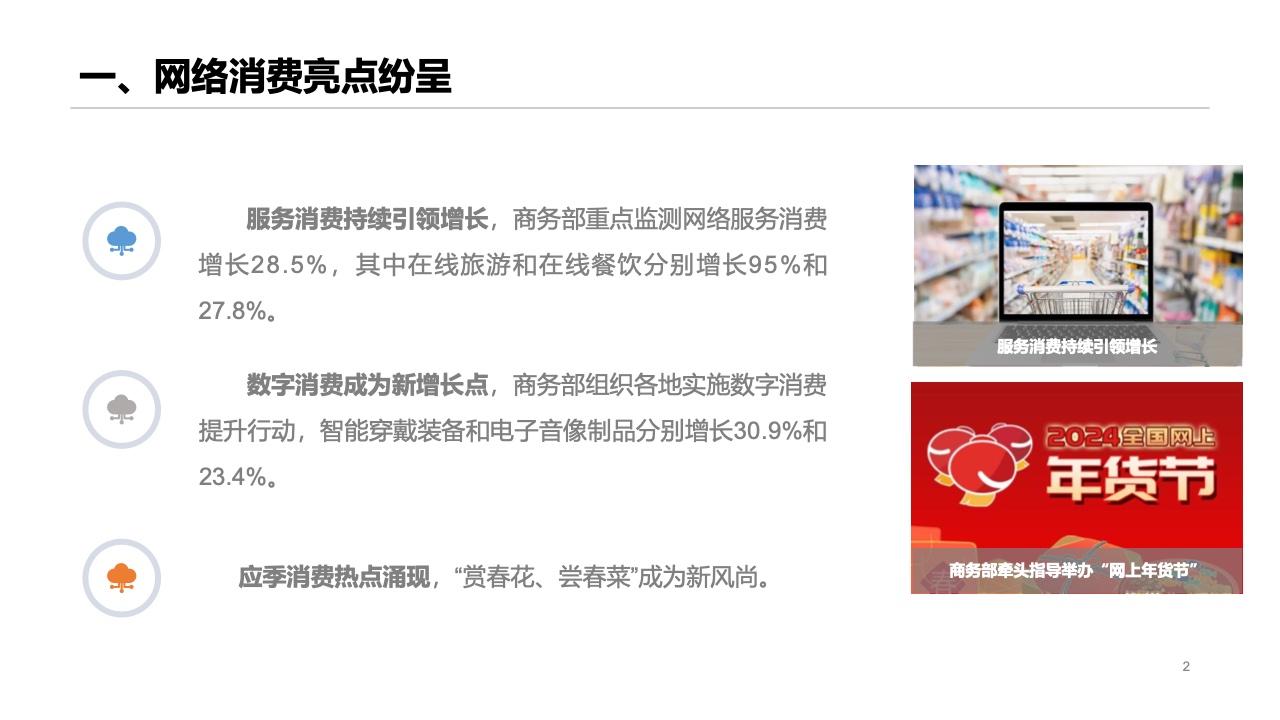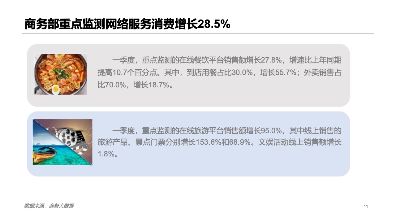服务消费持续引领增长,商务部重点监测网络服务消费增长28.5%,其中在线旅游和在线餐饮分别增长95%和27.8%。