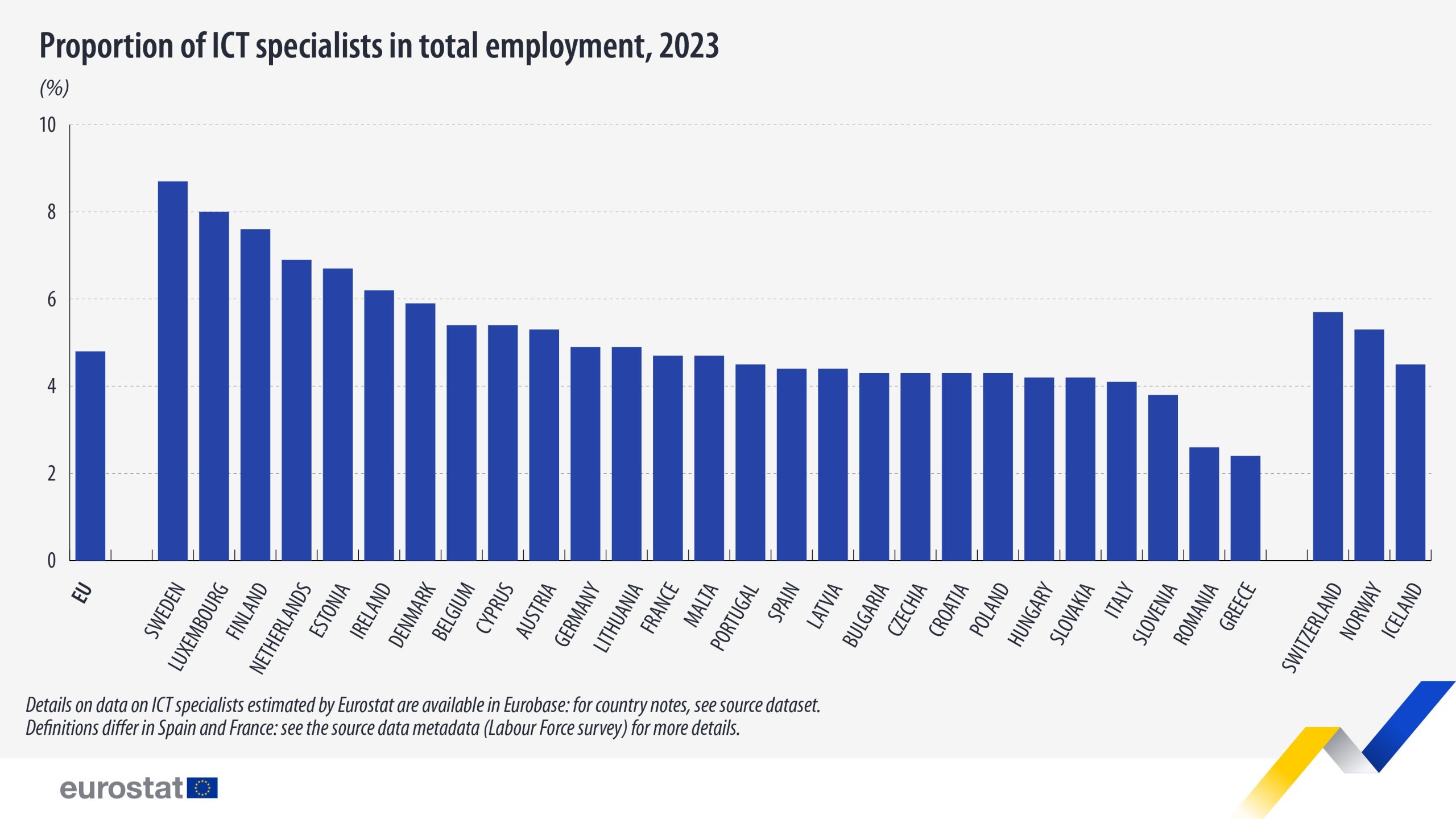 2023年,欧盟有980万人从事信息通信技术专家工作,占就业总人数的4.8%。