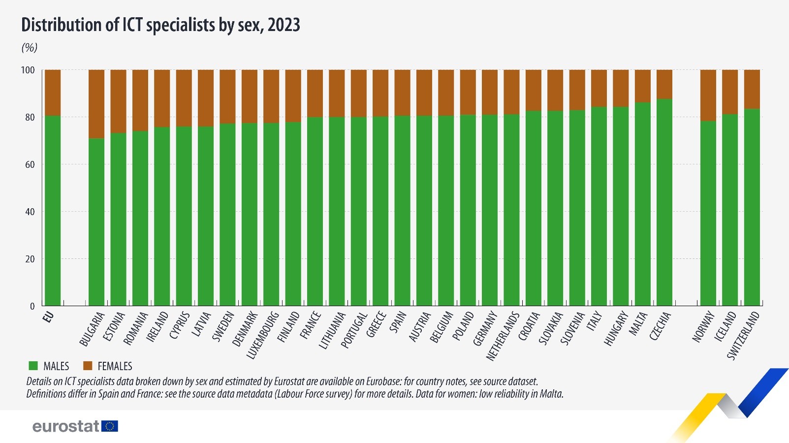 在国家层面上,保加利亚(29.1%)、爱沙尼亚(26.8%)和罗马尼亚(26.0%)在就业ICT就业的女性比例最高;而捷克(12.4%)、马耳他(13.8%)、匈牙利和意大利(均为15.7%)的比例最低。