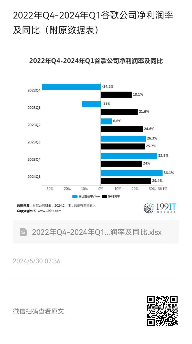 2022年Q4-2024年Q1谷歌公司净利润率及同比