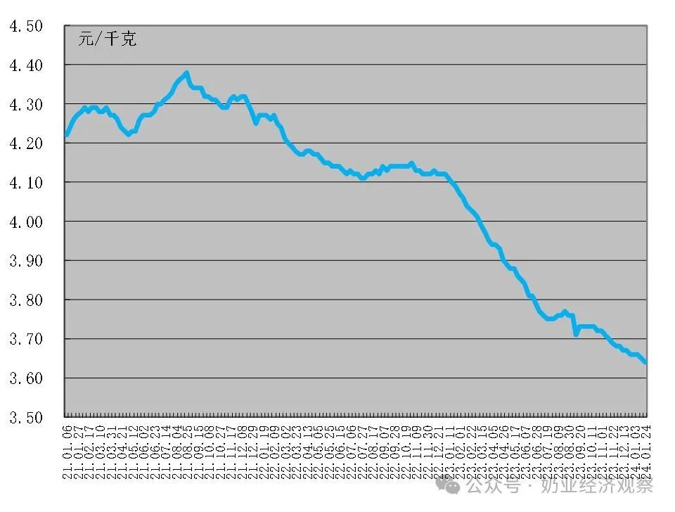 据农业农村部监测数据,2024年1月生鲜乳月度均价3.65元/千克,环比下跌0.5%,跌幅缩小0.3个百分点,同比下跌11.0%。最后一周3.64元/千克,比前一周下跌0.3%,同比下跌11.0%。