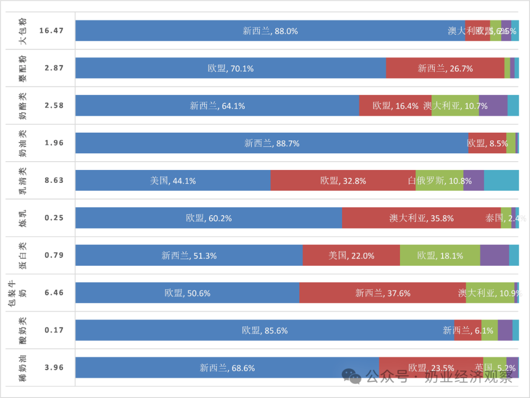 Figure 1‑1中国进口各类乳制品总量及主要来源国2024.1-2
