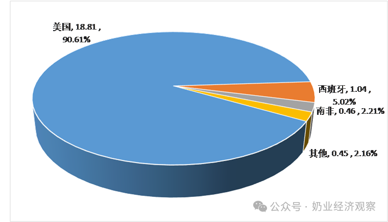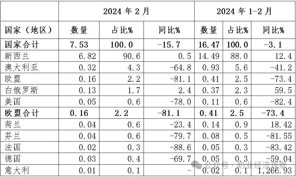 其中,从新西兰进口1.74万吨,占88.7%,同比减少10.4%;欧盟进口0.17万吨,占8.5%,同比增加21.3%。