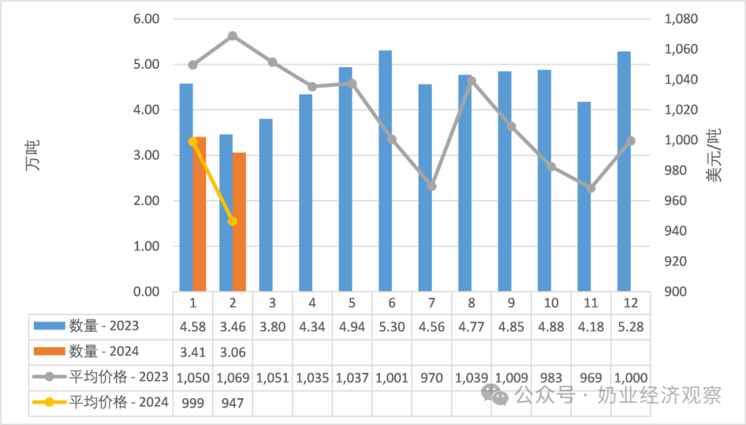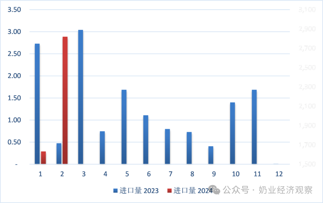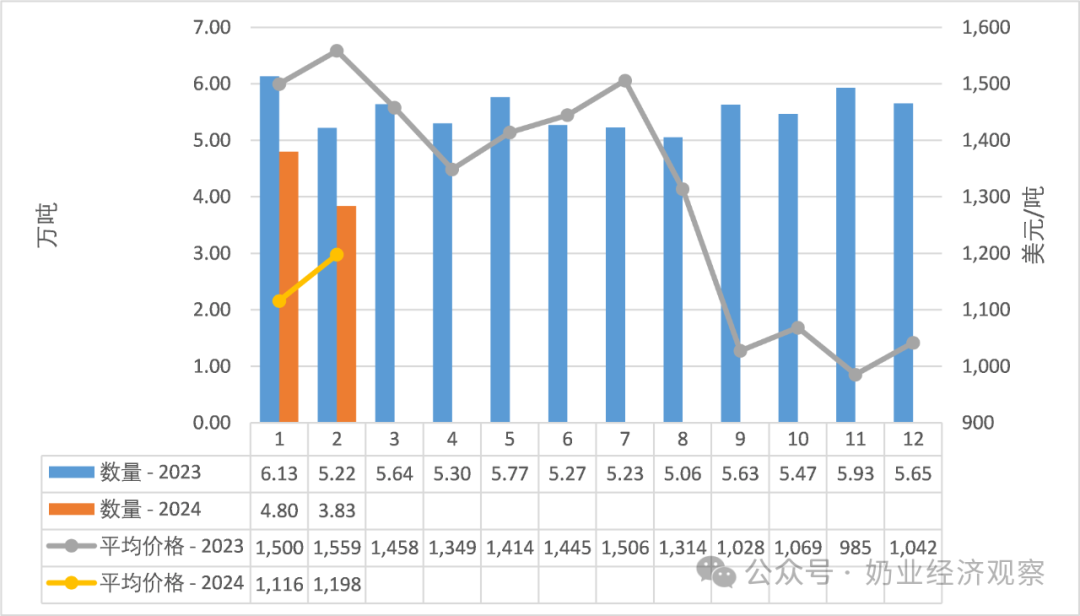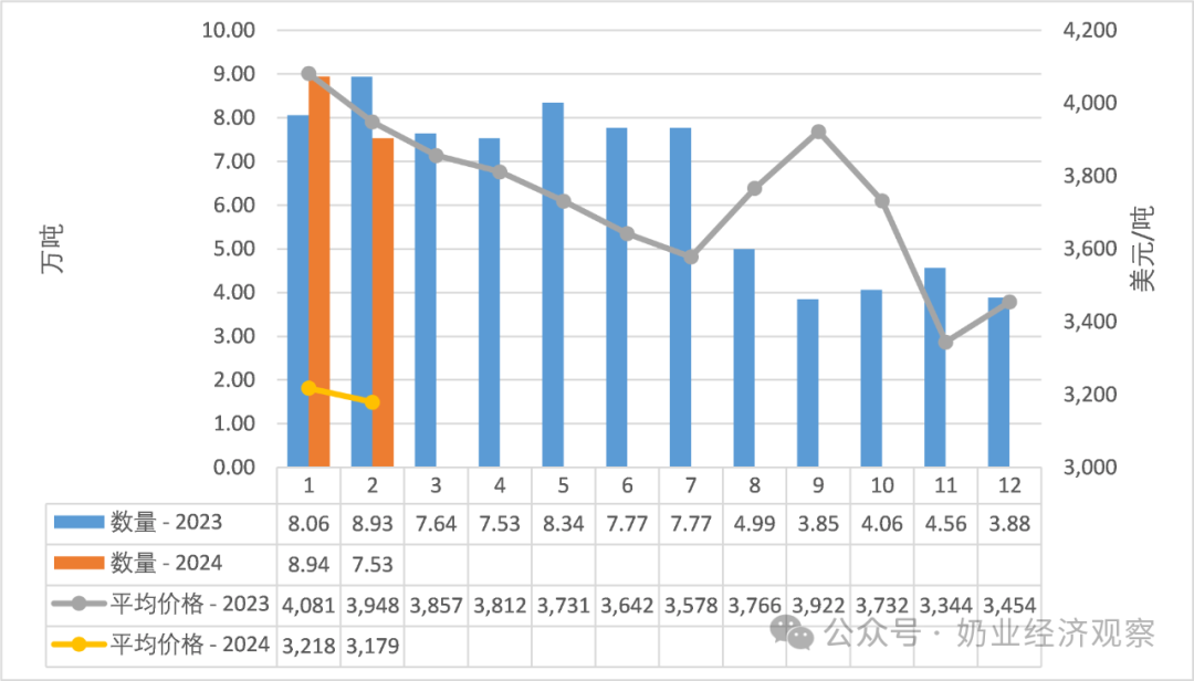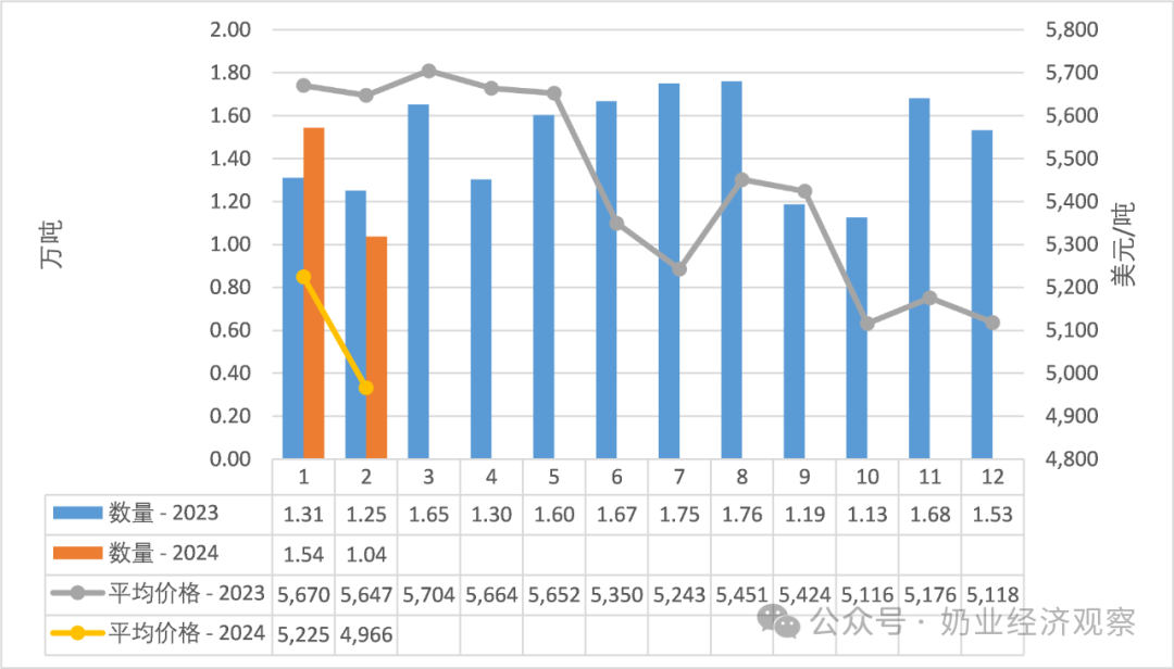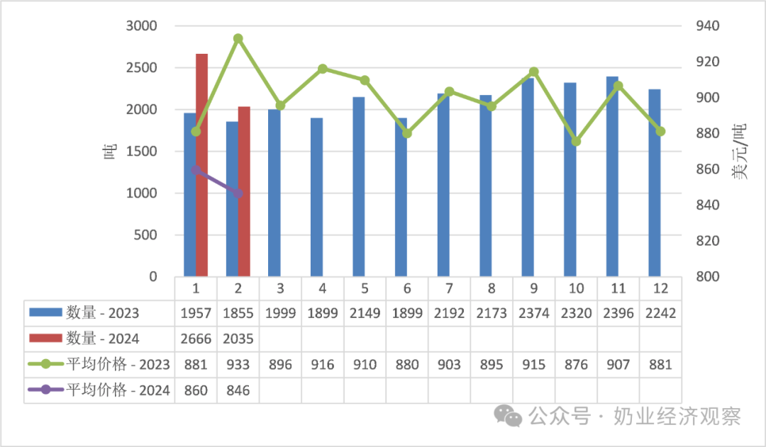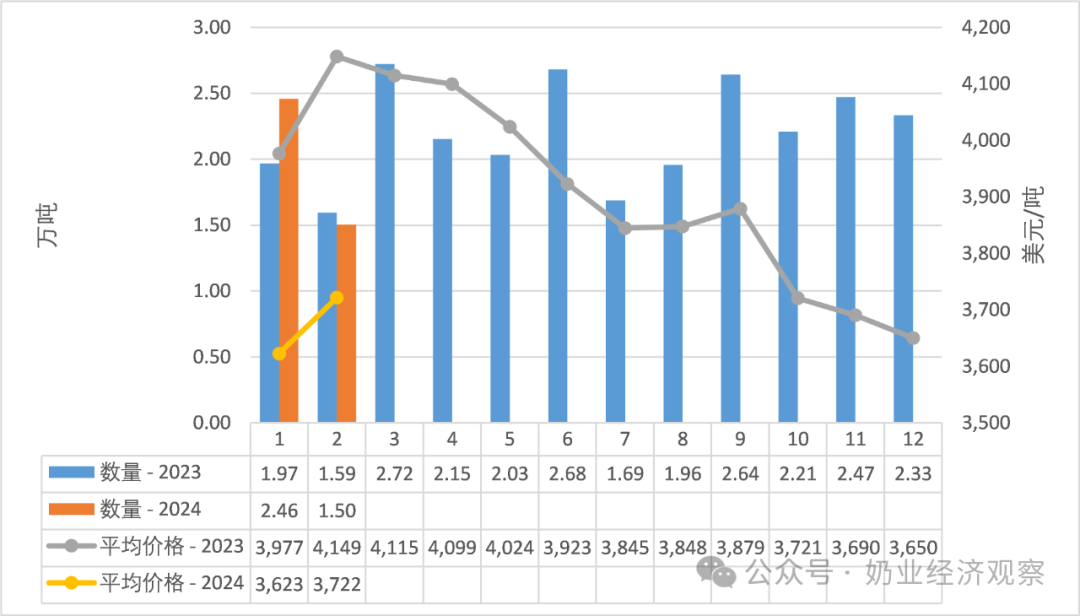 3.1.3 稀奶油1-2月进口+11.1%至3.96万吨,价格同比-9.7%