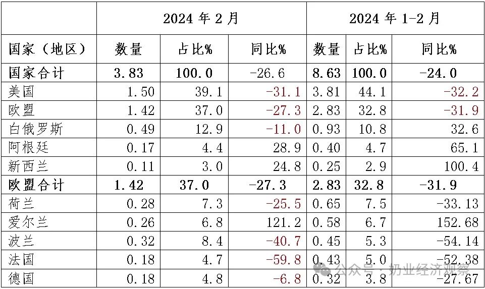 其中,从欧盟进口2.01万吨,占70.1%,同比减少42.1%;新西兰进口0.77万吨,占26.7%,同比减少21.1%。