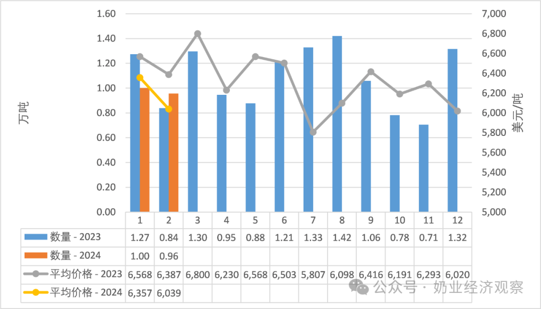 其中,从新西兰进口0.88万吨,占92.4%,同比增加15.9%;欧盟进口0.06万吨,占6.8%,同比增加4.4%。
