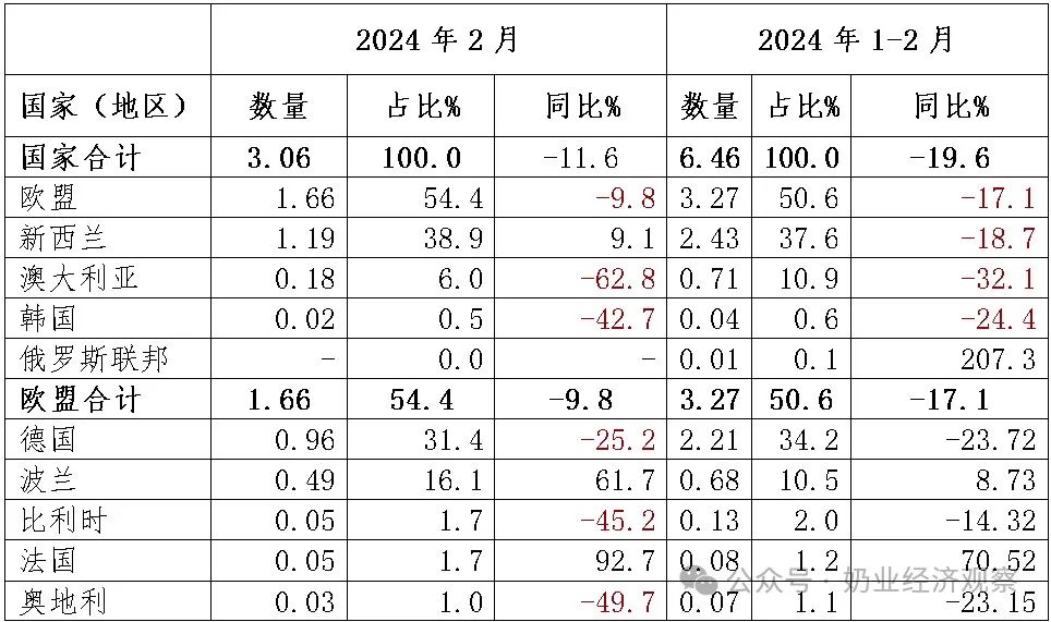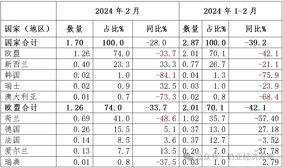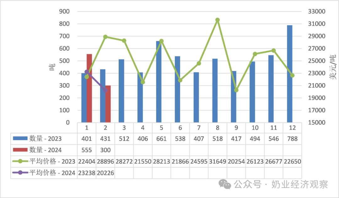 其中,从欧盟进口1.26万吨,占74%,同比减少33.7%;新西兰进口0.4万吨,占23.3%,同比增加33.3%。