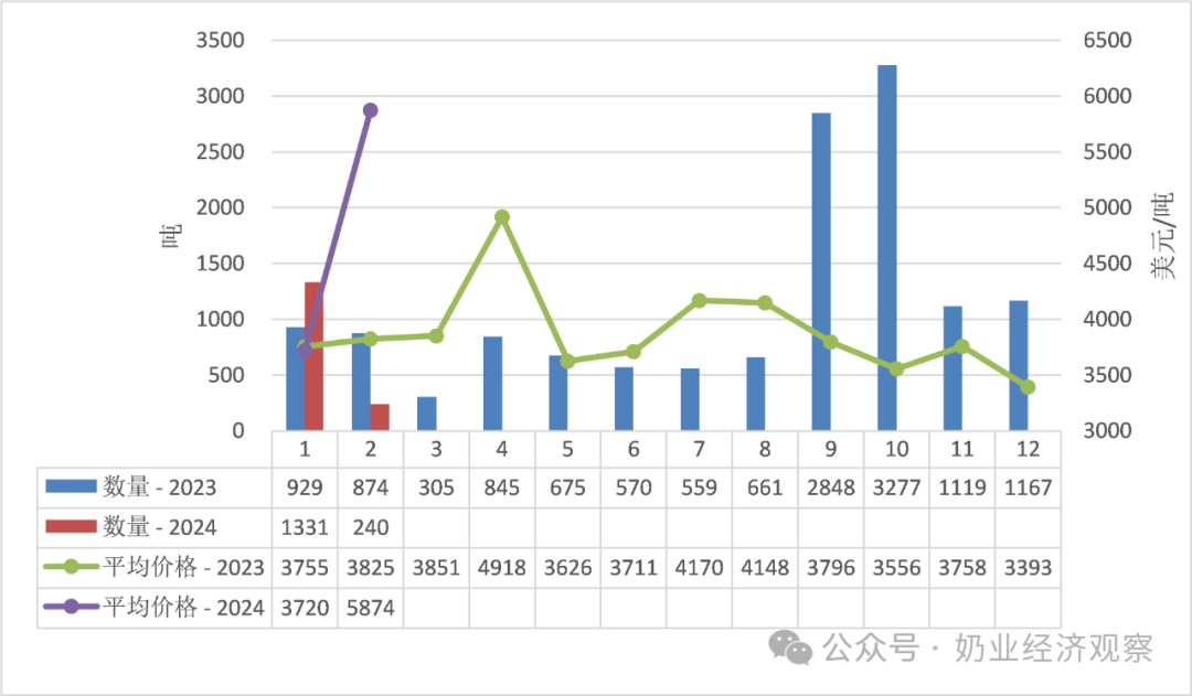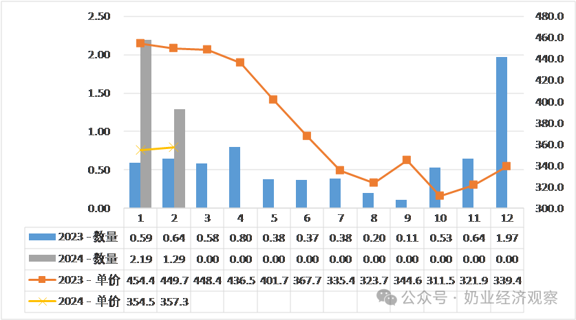 Figure3‑1中国婴幼儿配方奶粉月度进口量及价格2023-2024.1-2