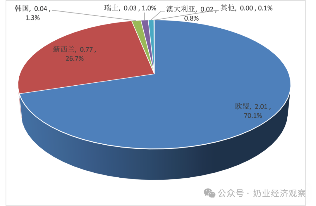 其中,从欧盟进口0.08万吨,占86.3%,同比减少46%;新西兰进口0.01万吨,占8.7%,同比减少27.2% 。