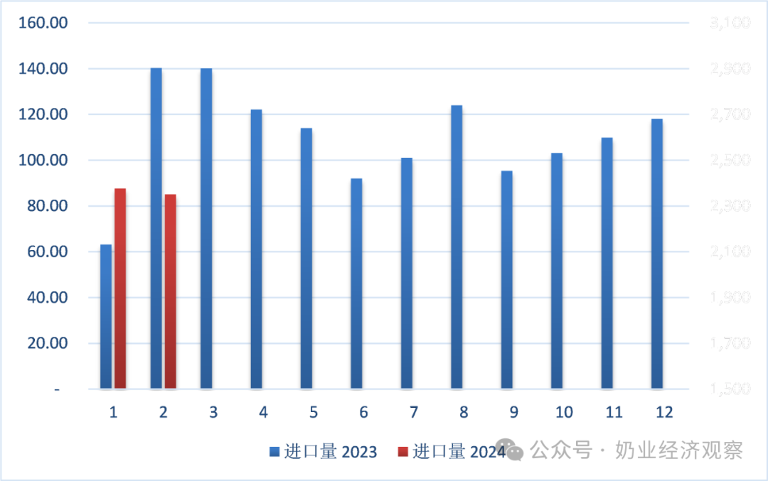 2024年1-2月我国共计进口各类乳制品44.14万吨,同比减少12.5%,进口额17.29亿美元,同比下降24.8%,进口乳制品折合生鲜乳为279万吨,同比减少12.9%(干制品按1:8,液态乳品按1:1折算,下同)。