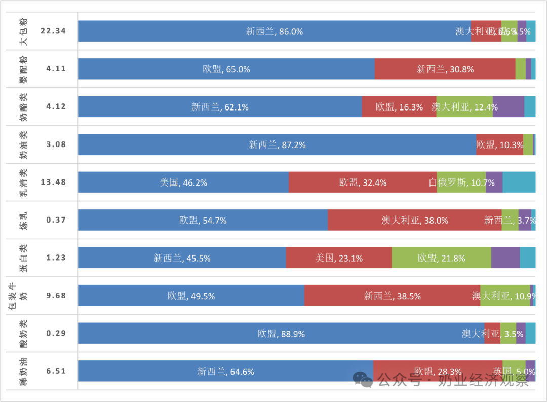 Figure 1‑1中国进口各类乳制品总量及主要来源国20241季度