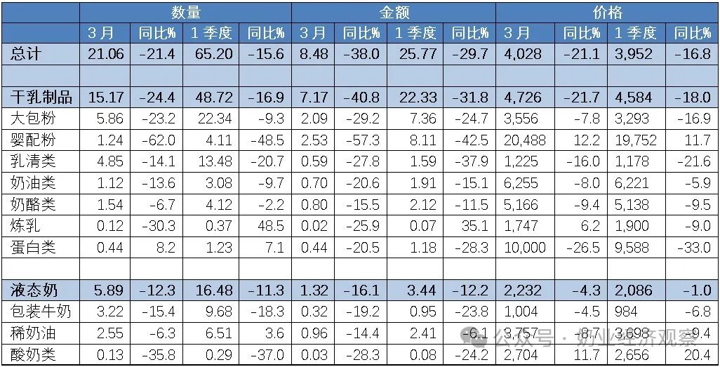 3月进口干乳制品15.17万吨,同比减少24.4%,进口额7.17亿美元,同比下降40.8%,主要的三大类产品包括,大包粉5.86万吨,占38.7%,乳清类4.85万吨,占32%,婴配粉1.24万吨,占8.2%。