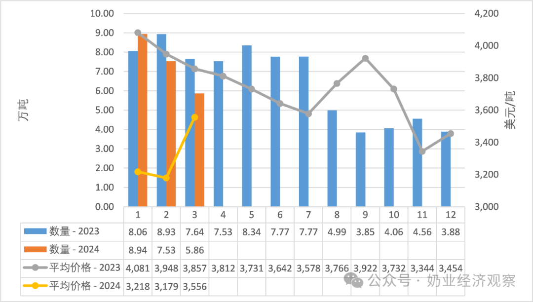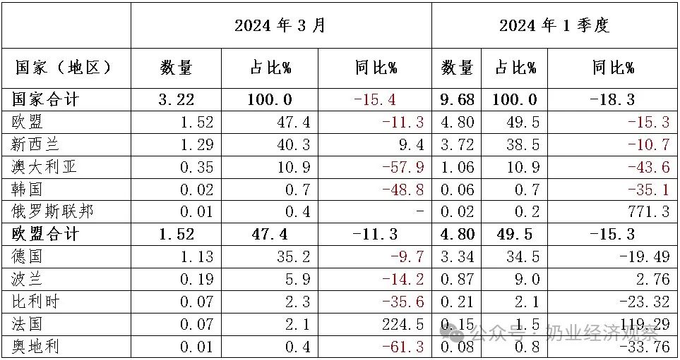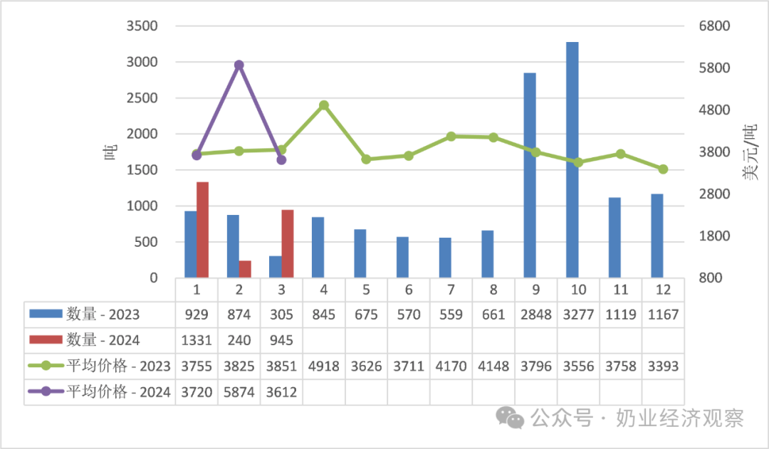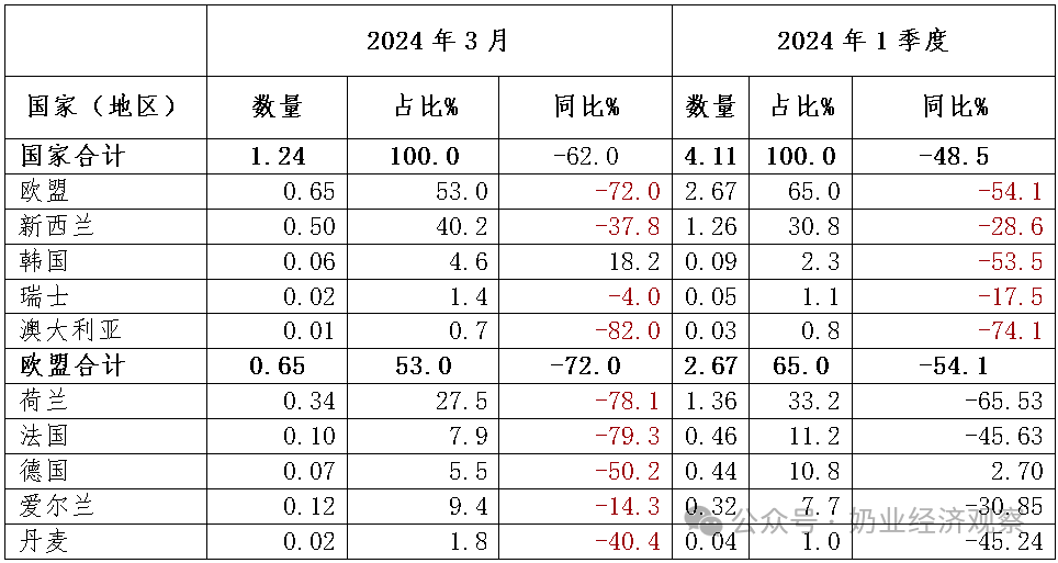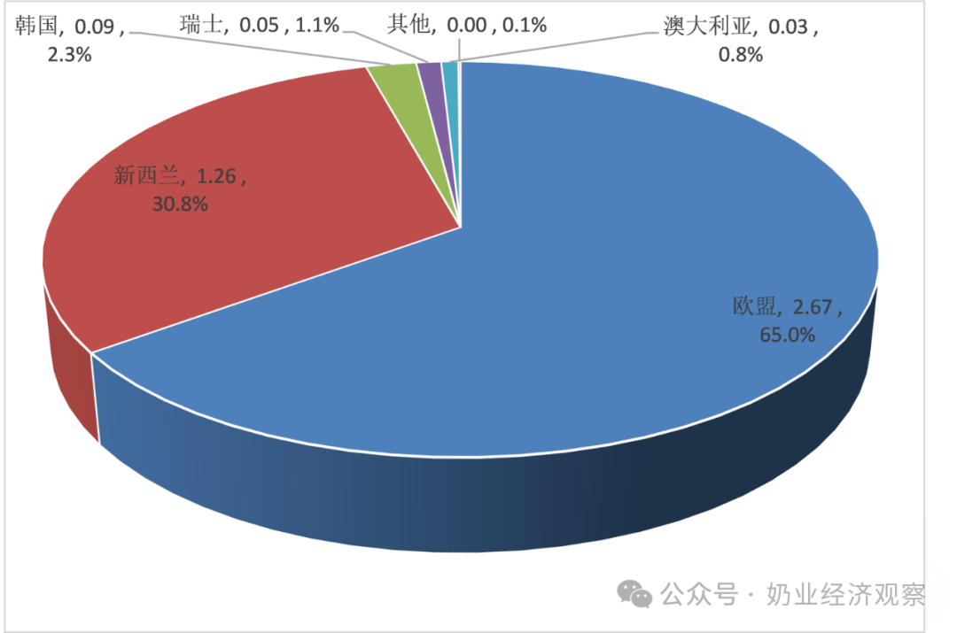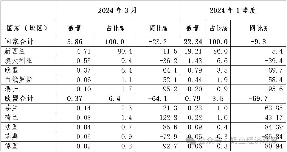 其中,从新西兰进口2.68万吨,占87.2%,同比减少13.7%;欧盟进口0.32万吨,占10.3%,同比增加24.6%。