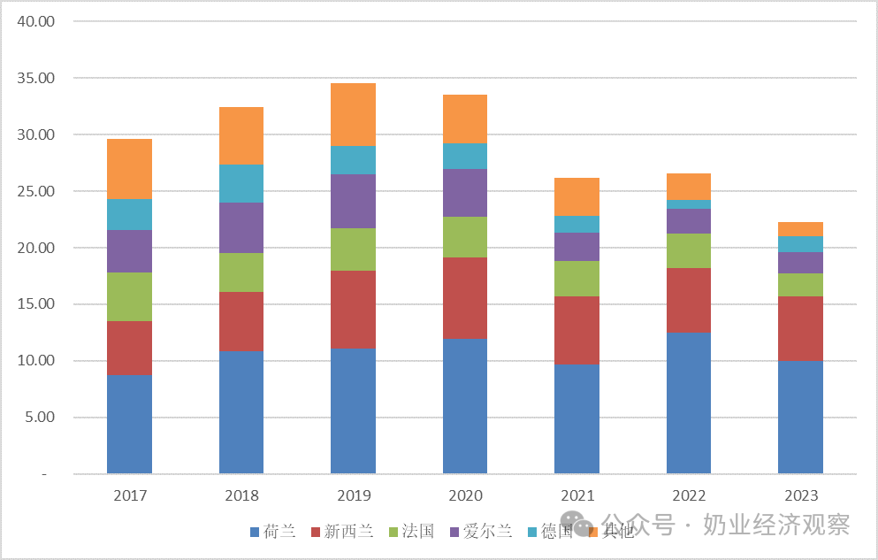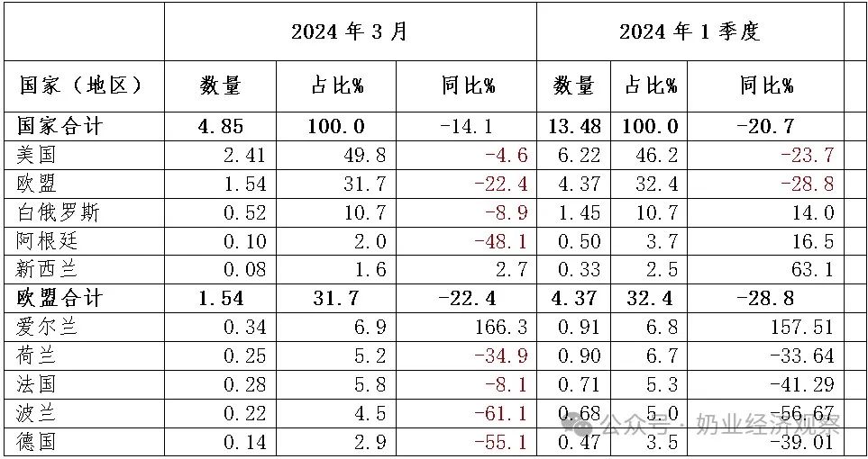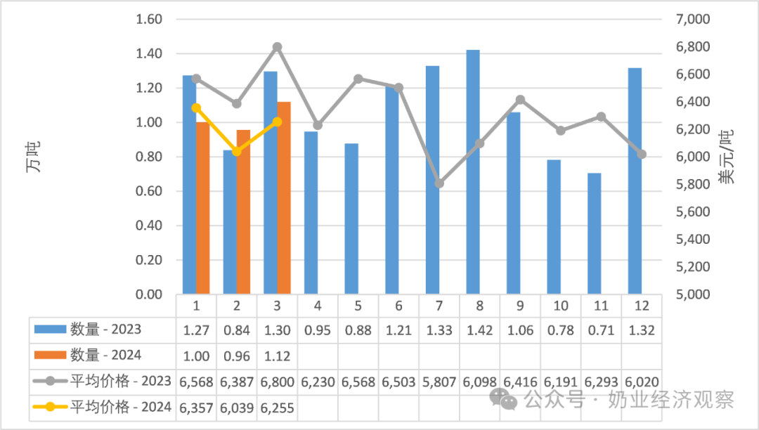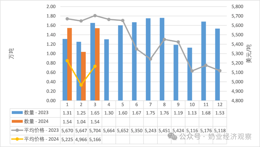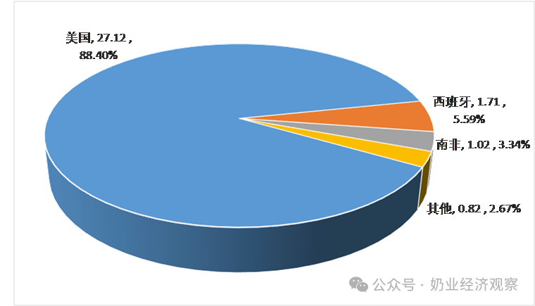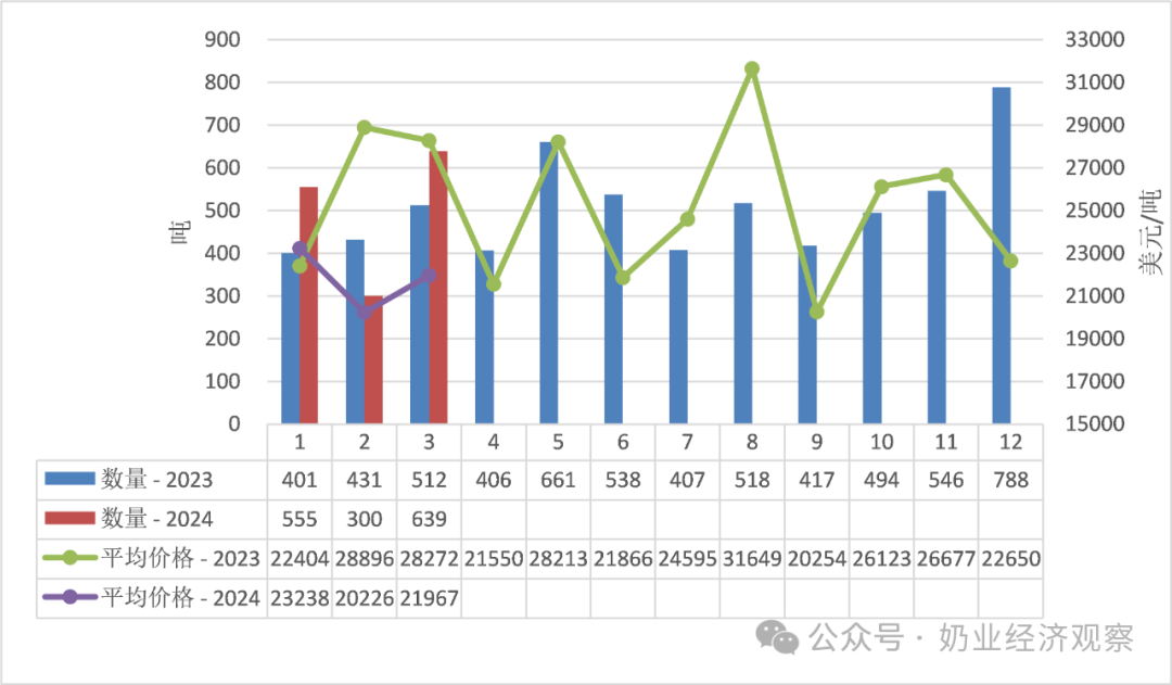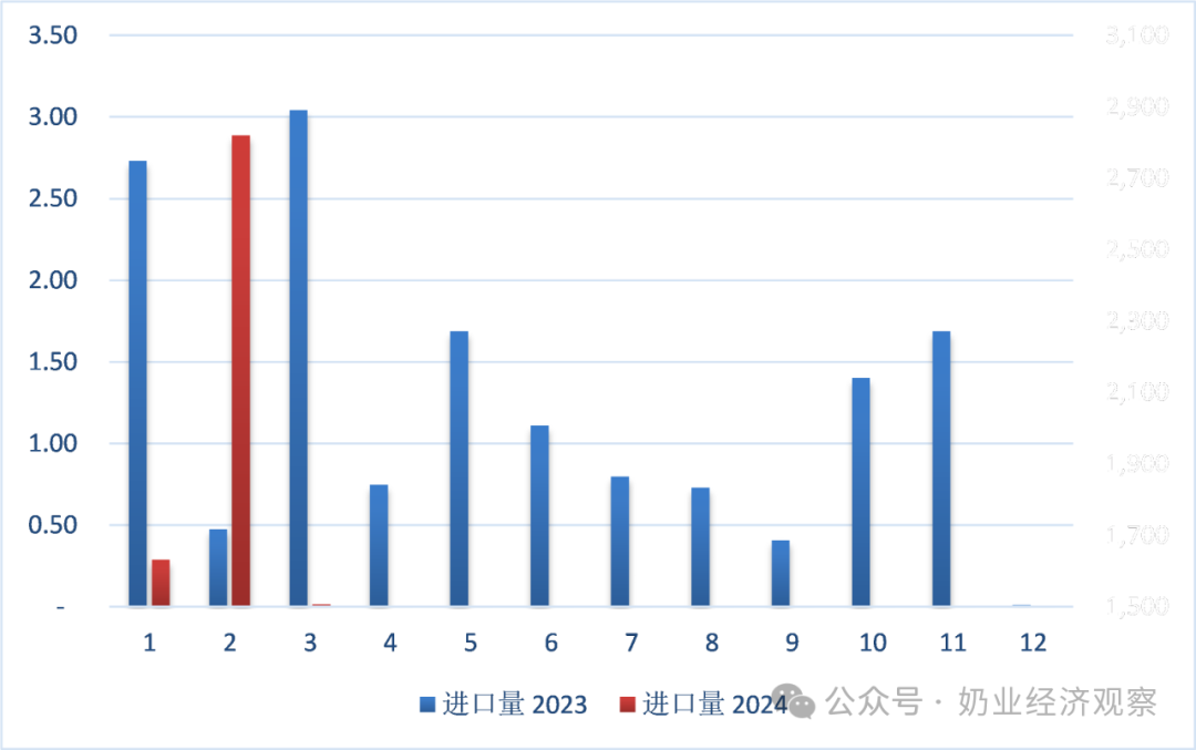 其中,从新西兰进口2.68万吨,占87.2%,同比减少13.7%;欧盟进口0.32万吨,占10.3%,同比增加24.6%。