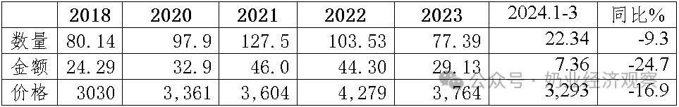 其中,从美国进口2.41万吨,占49.8%,同比减少4.6%;欧盟进口1.54万吨,占31.7%,同比减少22.4%;白俄罗斯进口0.52万吨,占10.7%,同比减少8.9%。