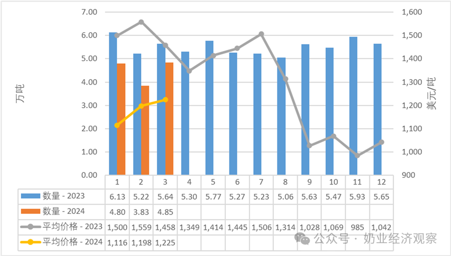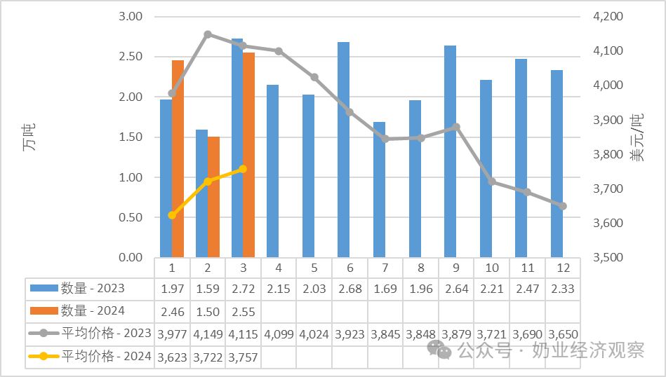 3.1.3 稀奶油1季度进口+3.6%至6.51万吨,价格同比-9.4%