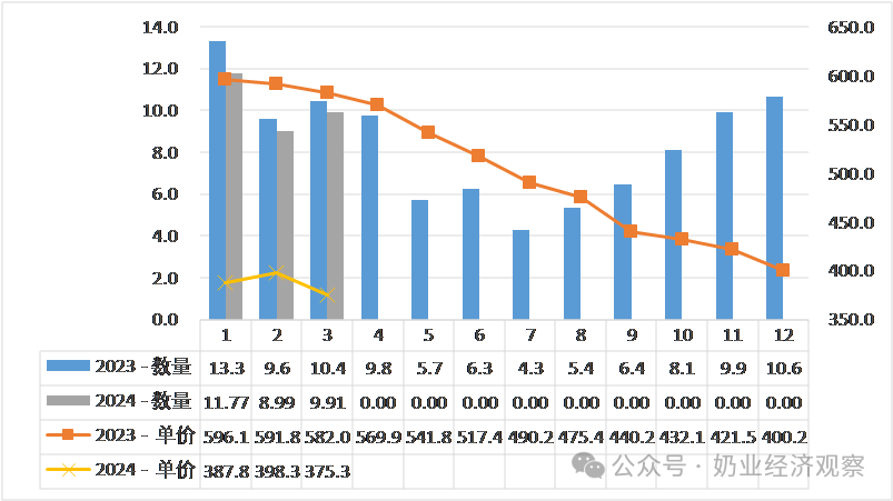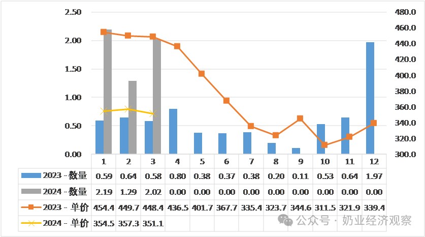 Figure3‑1中国婴幼儿配方奶粉月度进口量及价格2023-2024