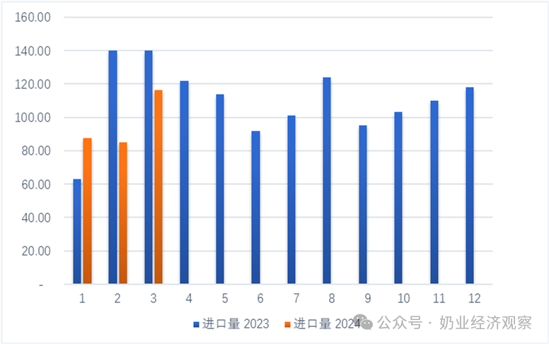 2024年3月我国共计进口各类乳制品21.06万吨,同比减少21.4%,进口额8.48亿美元,同比下降38%,折合生鲜乳127万吨,同比减少24%(干制品按1:8,液态奶按1:1折算)。