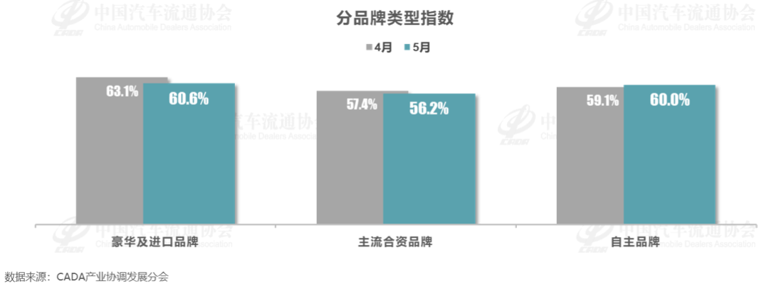 从分品牌类型指数看:5月豪华及进口、合资品牌指数环比小幅下降,自主品牌指数环比微升。