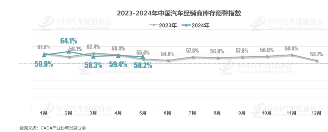 2024年5月31日,中国汽车流通协会发布的最新一期“中国汽车经销商库存预警指数调查”VIA(Vehicle Inventory Alert Index)显示,2024年5月中国汽车经销商库存预警指数为58.2%,同比上升2.8个百分点,环比下降1.2个百分点。库存预警指数位于荣枯线之上,汽车流通行业处在不景气区间。