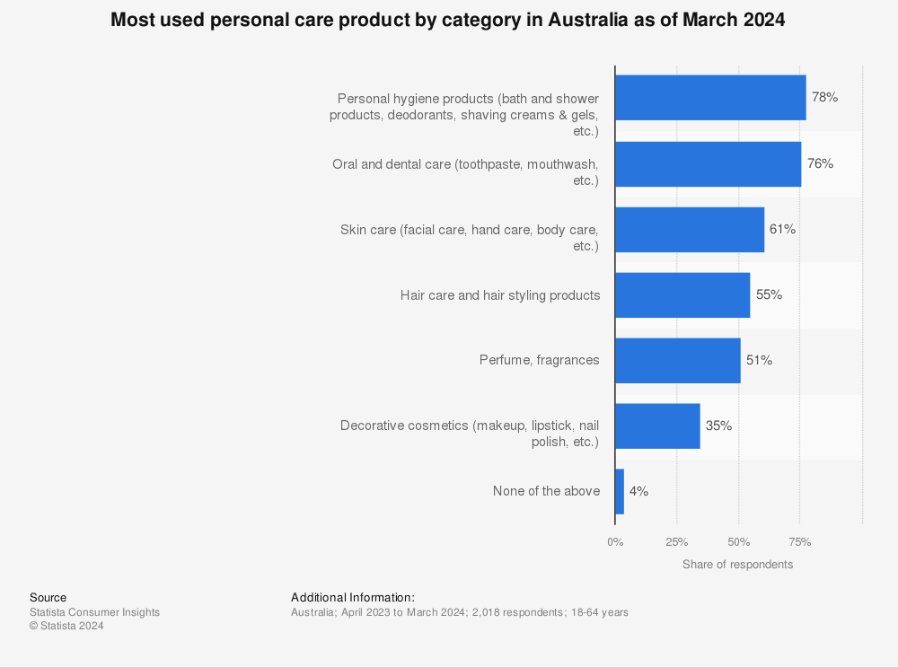 截至2024年3月,澳大利亚按类别使用最多的个人护理产品。数据来源:Statista.com