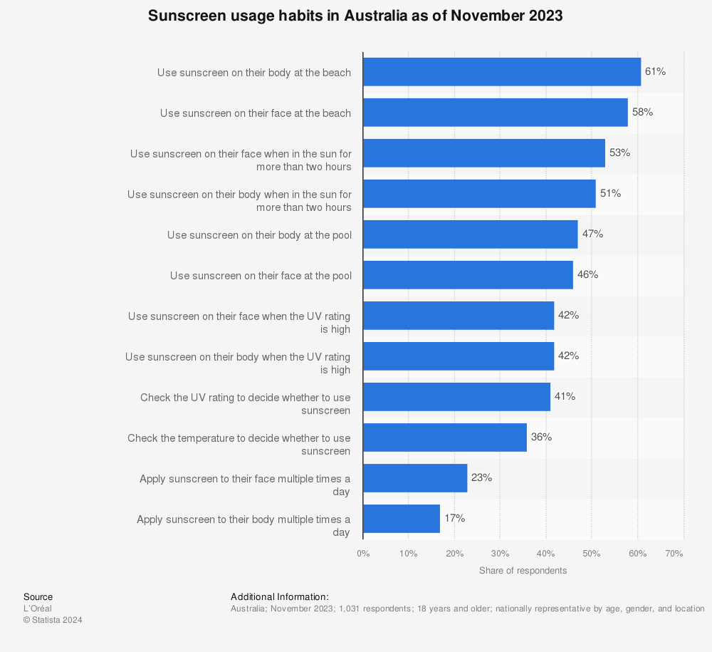 截至2023年11月,澳大利亚的防晒霜使用习惯。数据来源:Statista.com