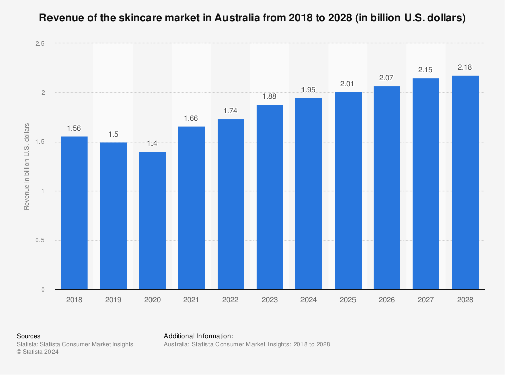 2018-2028年澳大利亚护肤品市场收入(亿美元)。数据来源:Statista.com