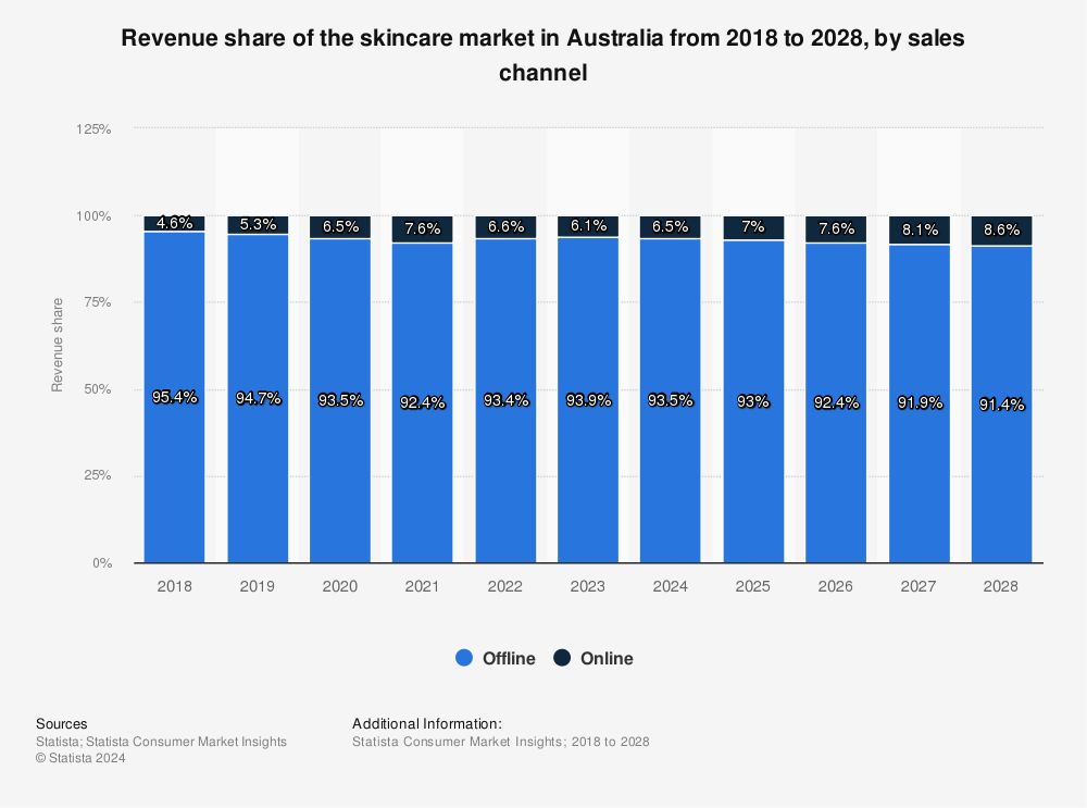 2018-2028年澳大利亚护肤品市场收入占比,按销售渠道划分。数据来源:Statista.com