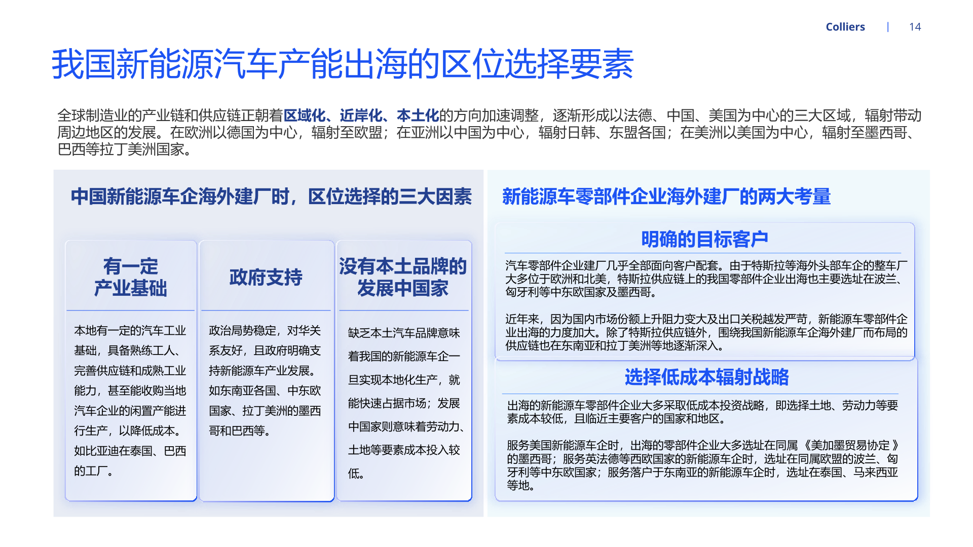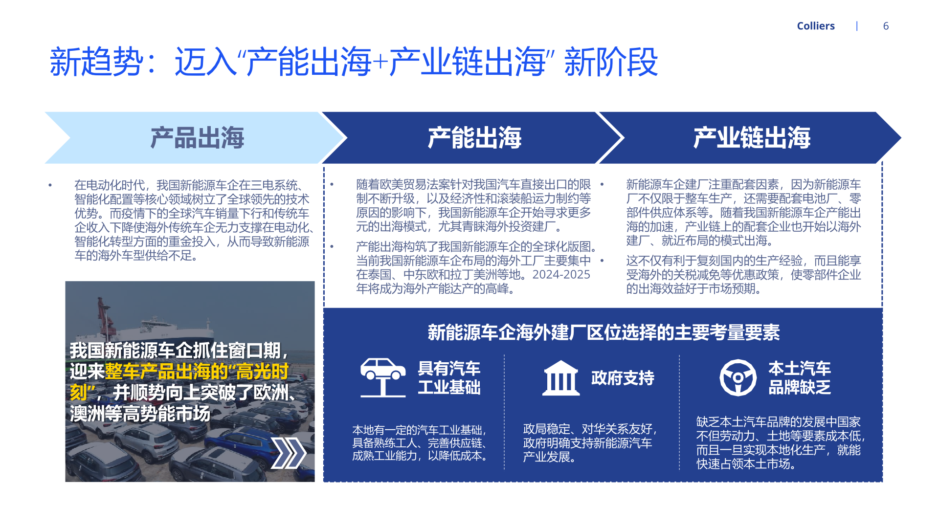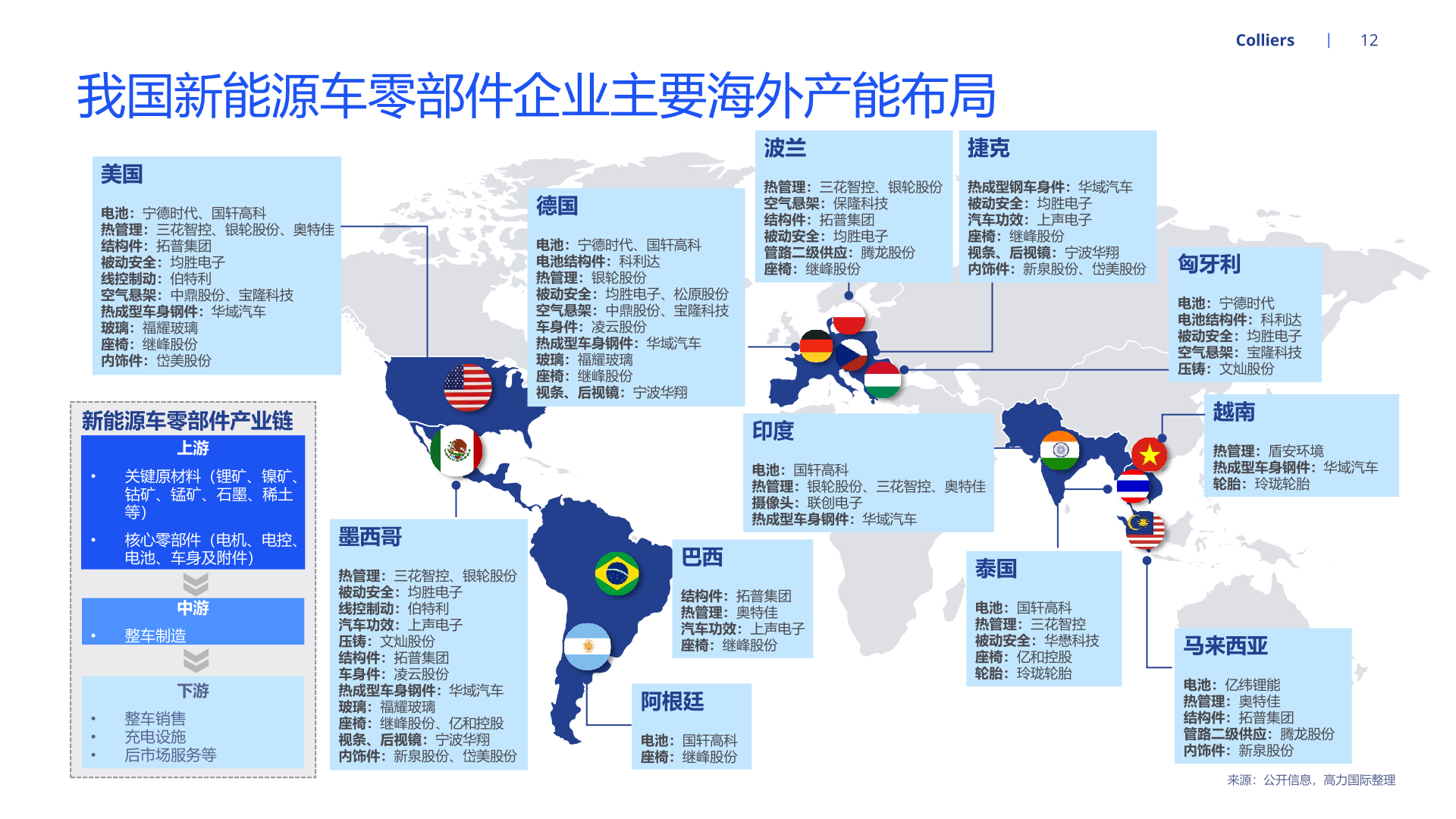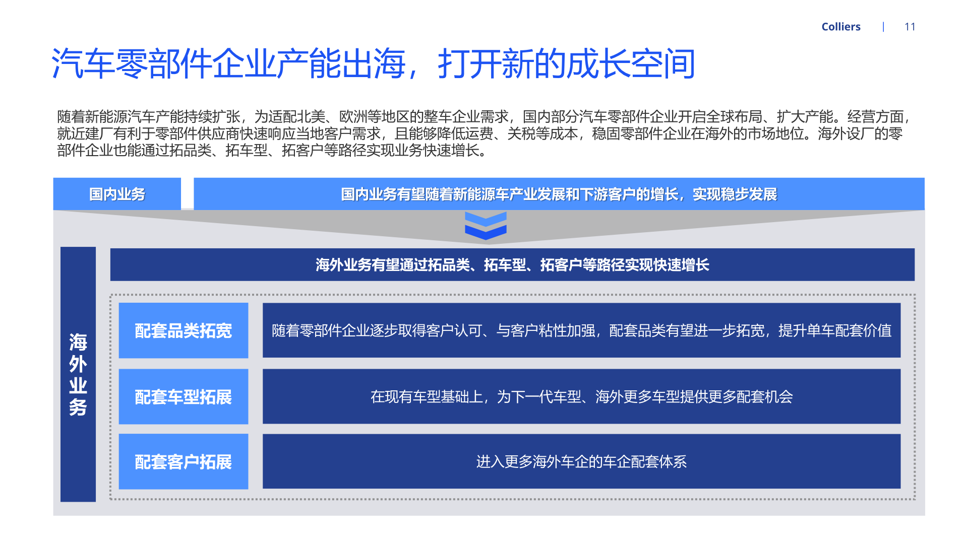 随着新能源汽车产能持续扩张,为适配北美、欧洲等地区的整车企业需求,国内部分汽车零部件企业开启全球布局、扩大产能。经营方面, 就近建厂有利于零部件供应商快速响应当地客户需求,且能够降低运费、关税等成本,稳固零部件企业在海外的市场地位。海外设厂的零 部件企业也能通过拓品类、拓车型、拓客户等路径实现业务快速增长。